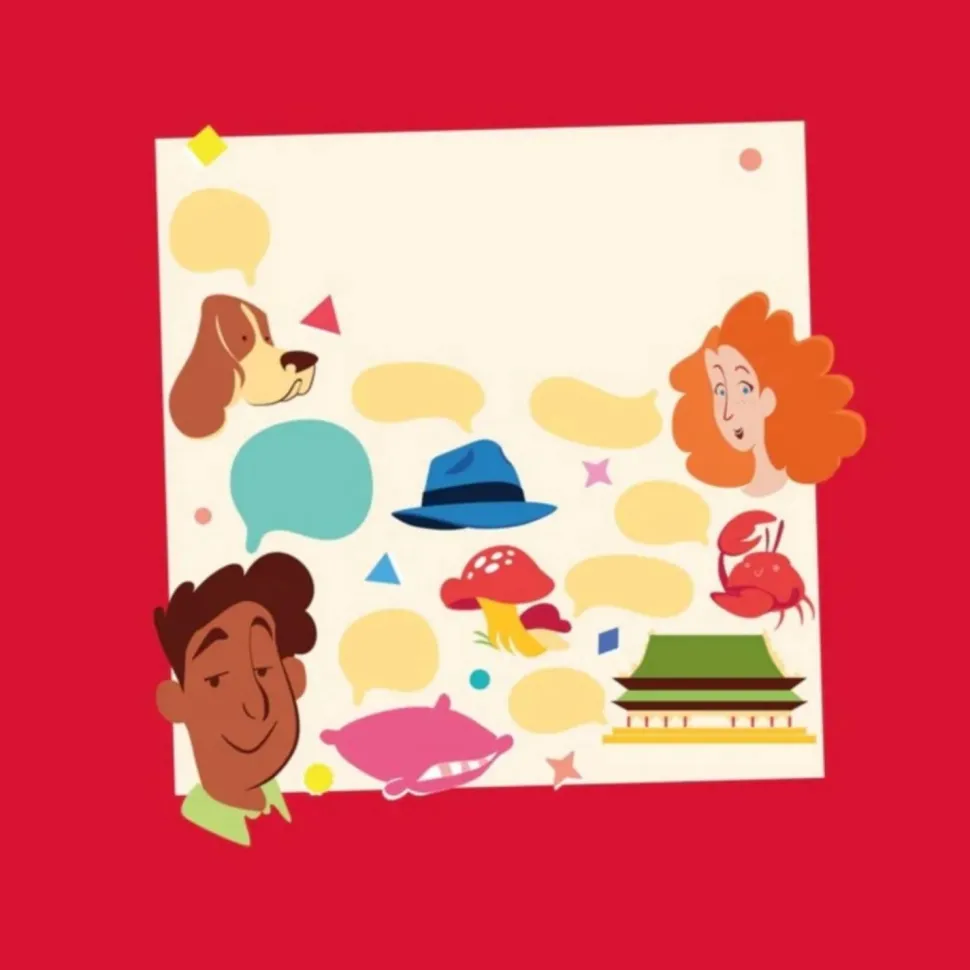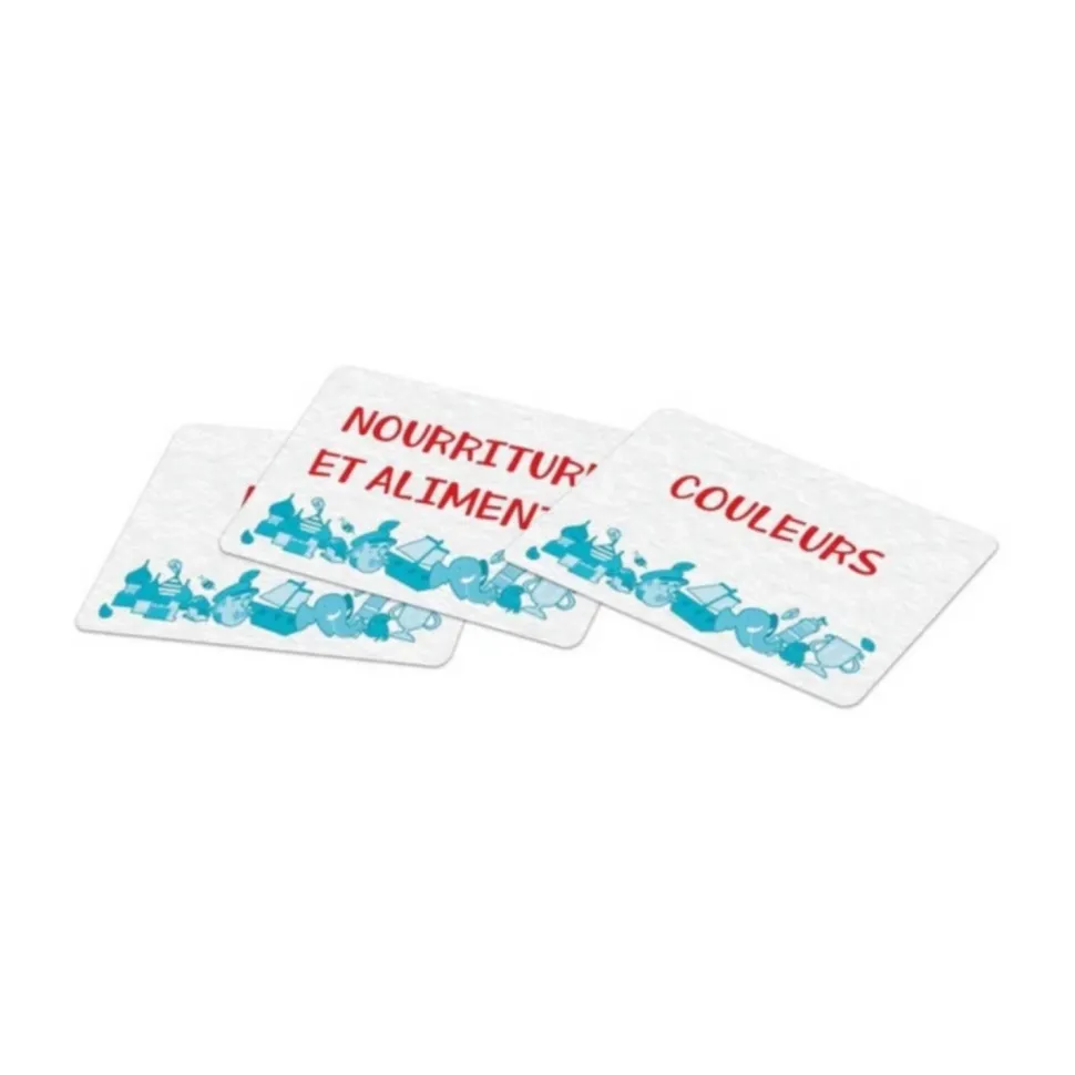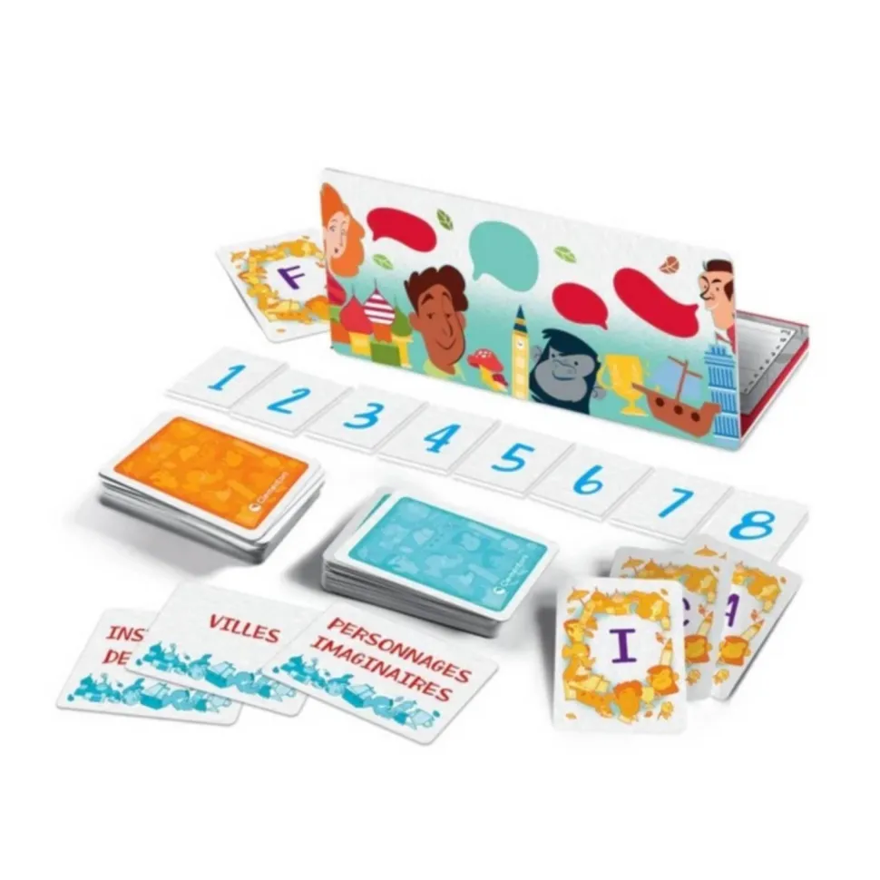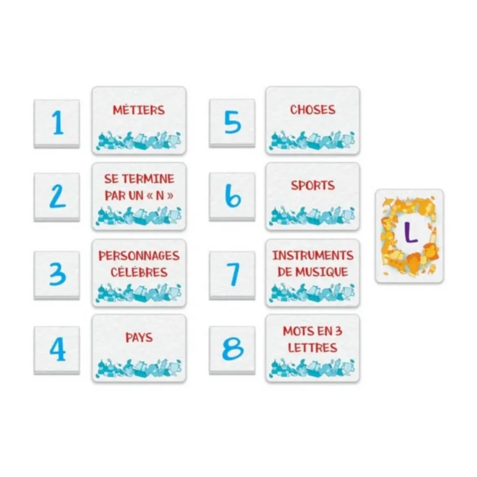 Contient un paquet de cartes Catégorie (Prénoms, Choses, Villes…), un paquet de cartes Lettre, des blocs pour écrire les mots et un sablier.