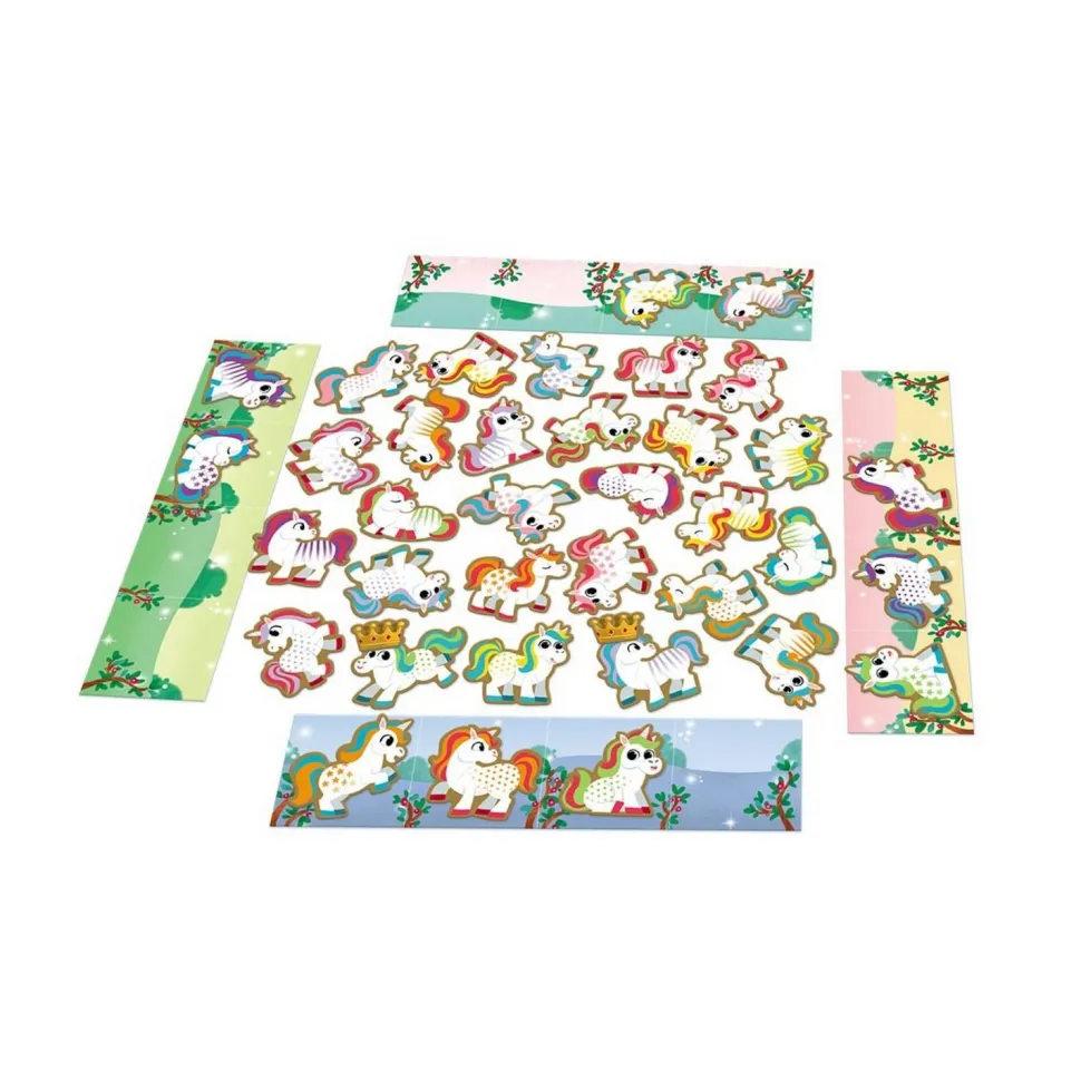 Chaque licorne est unique et les joueurs devront retrouver celle qui correspond à la combinaison indiquée par les dés. Les 2 couleurs et le motif. Deviens le premier joueur à placer 4 licornes dans ton pré.