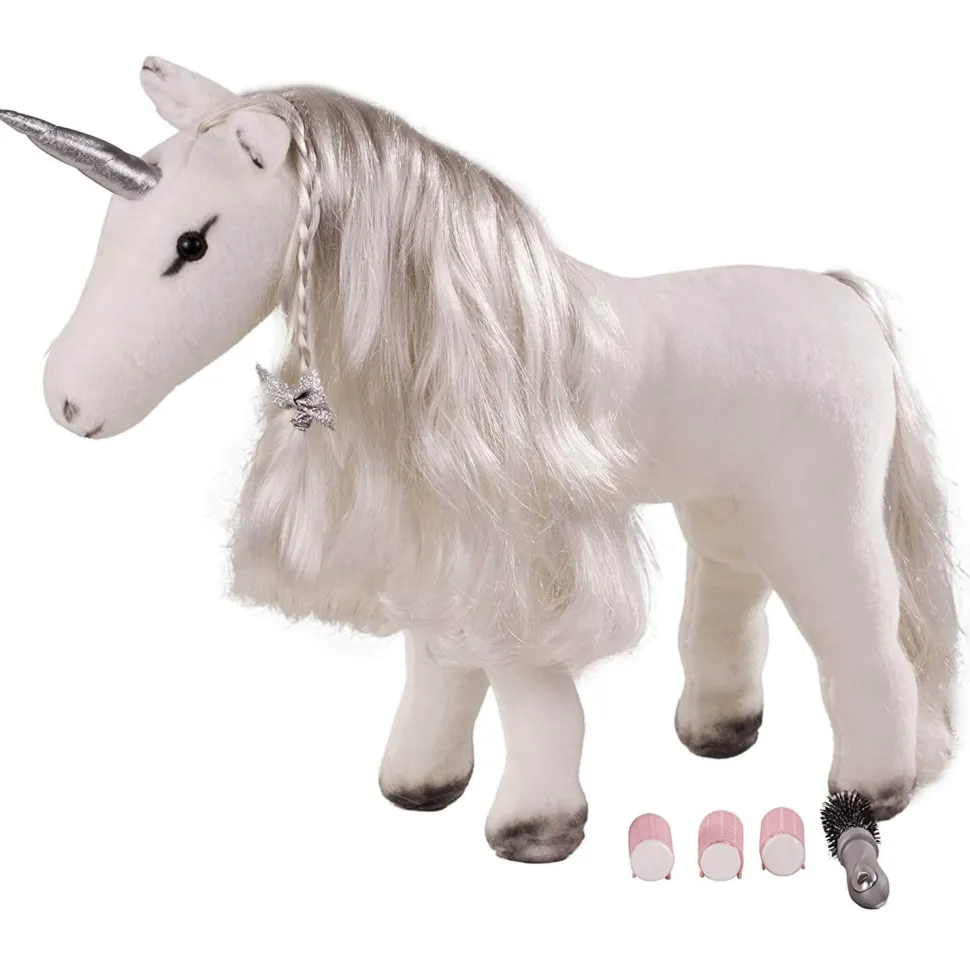 Vous rêvez d’avoir une licorne comme amie ? Découvrez cette magnifique licorne de 52 cm et apprenez à prendre soi d’elle !Cette licorne blanche avec sa corne argentée dispose d’une belle crinière que vous allez adorer peigner. Vous aimerez passer des heures à la coiffer, à lui faire des tresses et à lui mettre des bigoudis. Pour cela, vous aurez à votre disposition les accessoires nécessaires : 1 brosse et 3 rouleaux.Cette licorne pourra aussi partager des moments magiques avec votre poupée, alors faites la grimper sur son dos !A vous les belles histoires féériques avec cette licorne !Convient pour les poupées jusqu’à 50 cm.Hauteur de la licorne : 52 cm.Hauteur de la licorne au garrot : 37 cm.