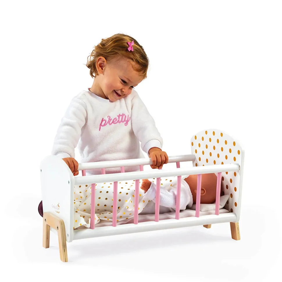Ce magnifique lit en bois aux reflets scintillants est idéal pour border son poupon et l’emmener doucement au pays des rêves. Avec son oreiller, son matelas et sa couverture à pois dorés, il est parfait pour prendre soin de son poupon préféré !