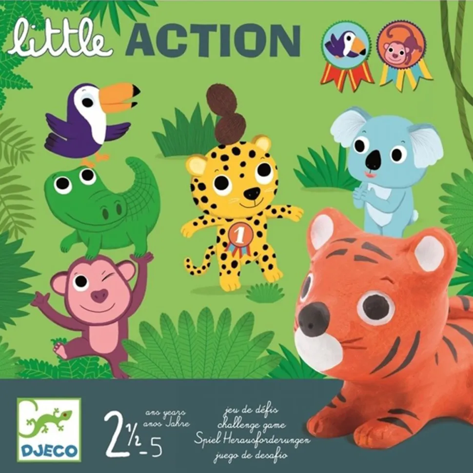 Little action, un jeu de défis original avec de petites figurines en forme d’animaux de la jungle !Contenu de la boîte :- des cartes défis- 6 figurines (toucan, crocodile, singe, koala, tigre, panthère)C’est la fête dans la jungle !Construire une pyramide, jouer aux quilles, lancer et rattraper… autant de petits défis à réussir pour gagner des médailles !Réussirez-vous les différents défis proposés sur les cartes de jeu ? Pour cela, vous devrez certainement faire preuve d’adresse !Nombre de joueurs : de 2 à 4.Durée moyenne de la partie : 10 minutes.A partir de 2 ans et demi.