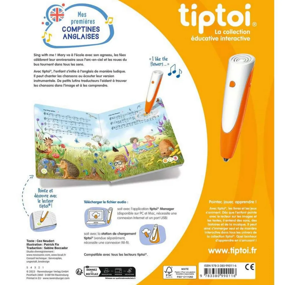 Retrouvez sur notre site le Livre Interactif Tiptoi – Mes premières comptines anglaises de la marque Ravensburger ! Le lecteur Tiptoi (stylo) est non inclus et vendu séparément.