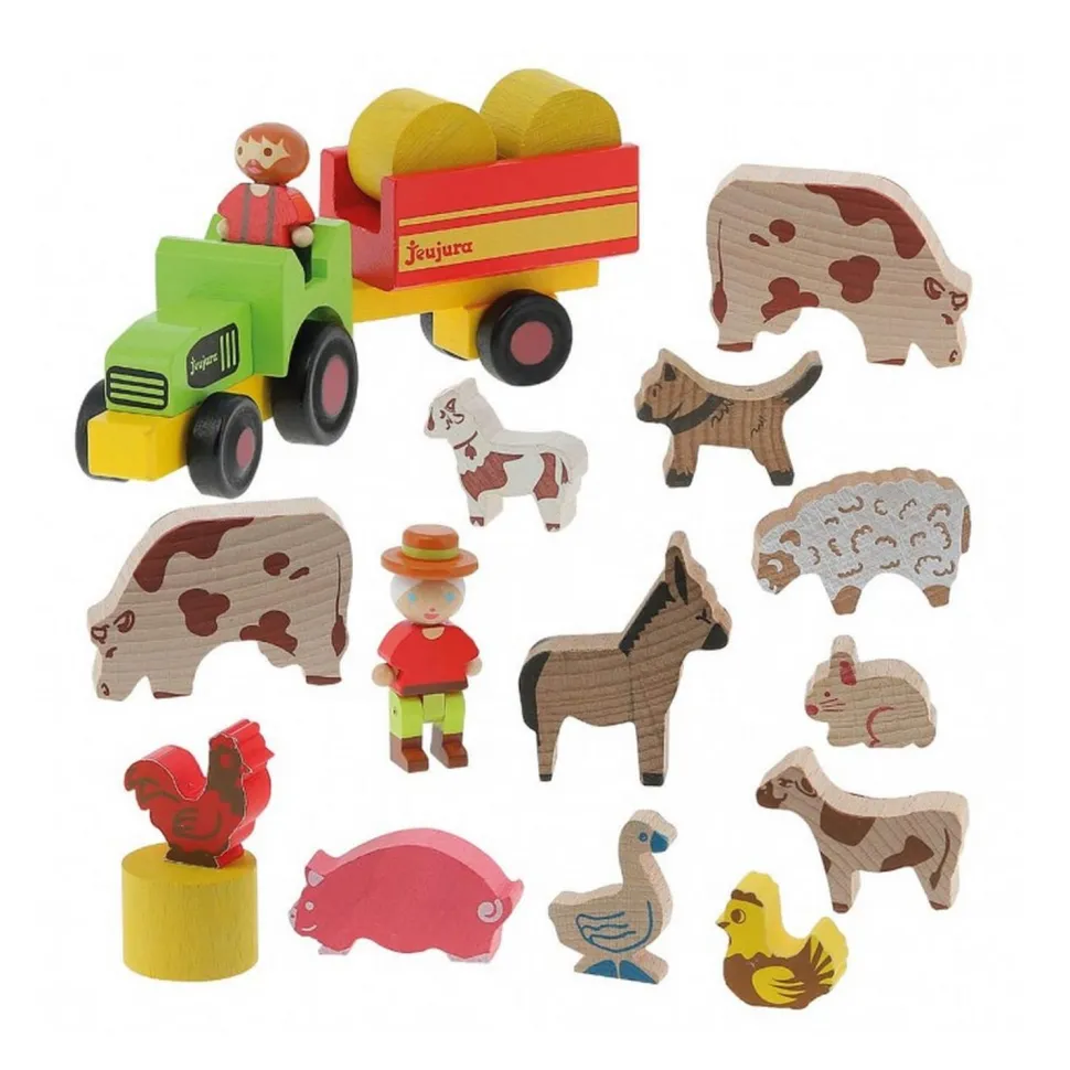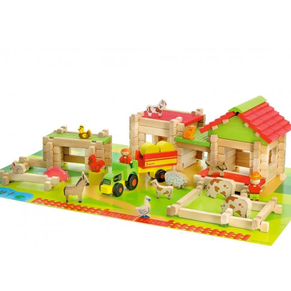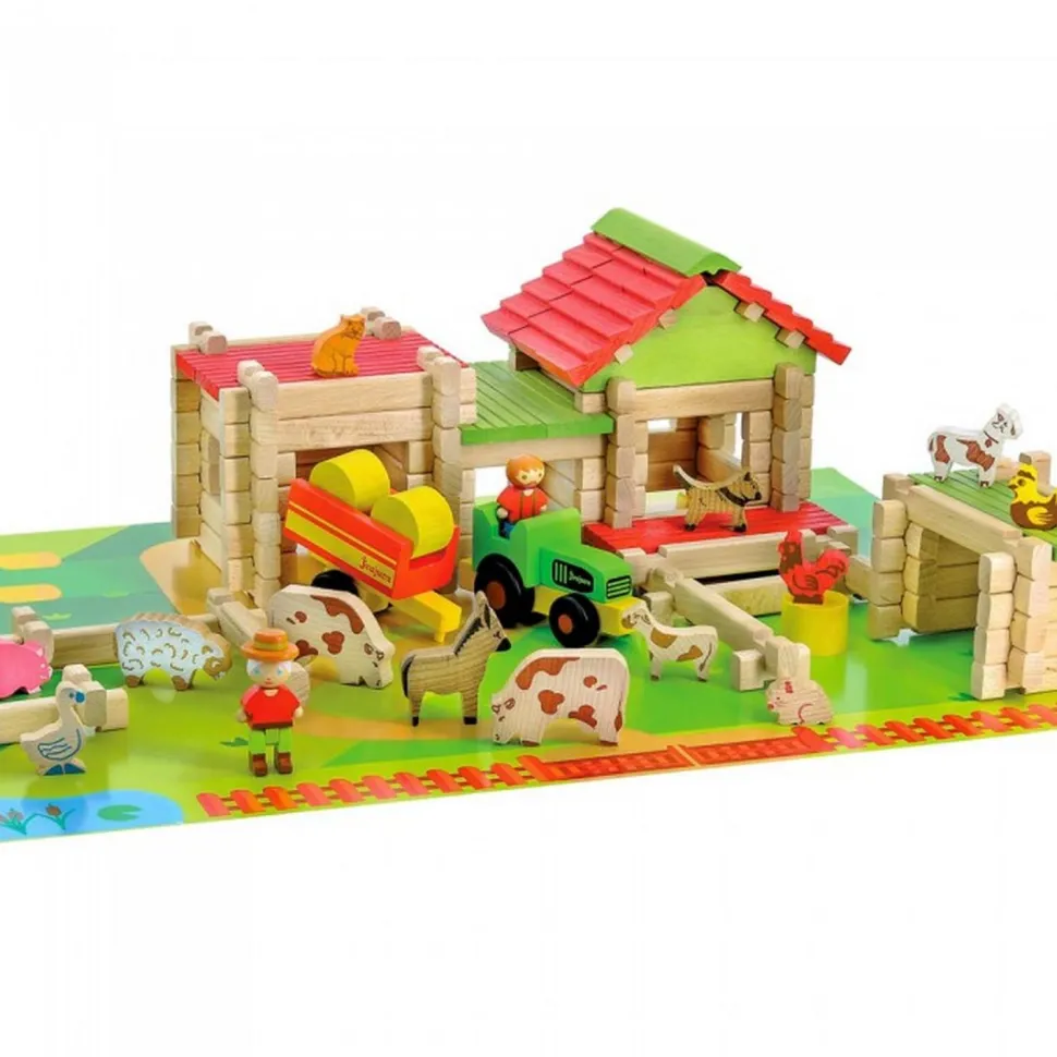 Pour découvrir l’univers de la ferme et le métier de l’agriculture et afin de développer sa maîtrise du geste, à partir de grosses pièces en hêtre pour faciliter l’apprentissage de la construction, l’enfant construira sa ferme en emboîtant tout simplement les pièces en bois les unes dans les autres. Il pourra ensuite s’amuser dans l’univers qu’il aura entièrement construit et imaginé avec le tracteur, sa remorque, les personnages et tous les animaux.