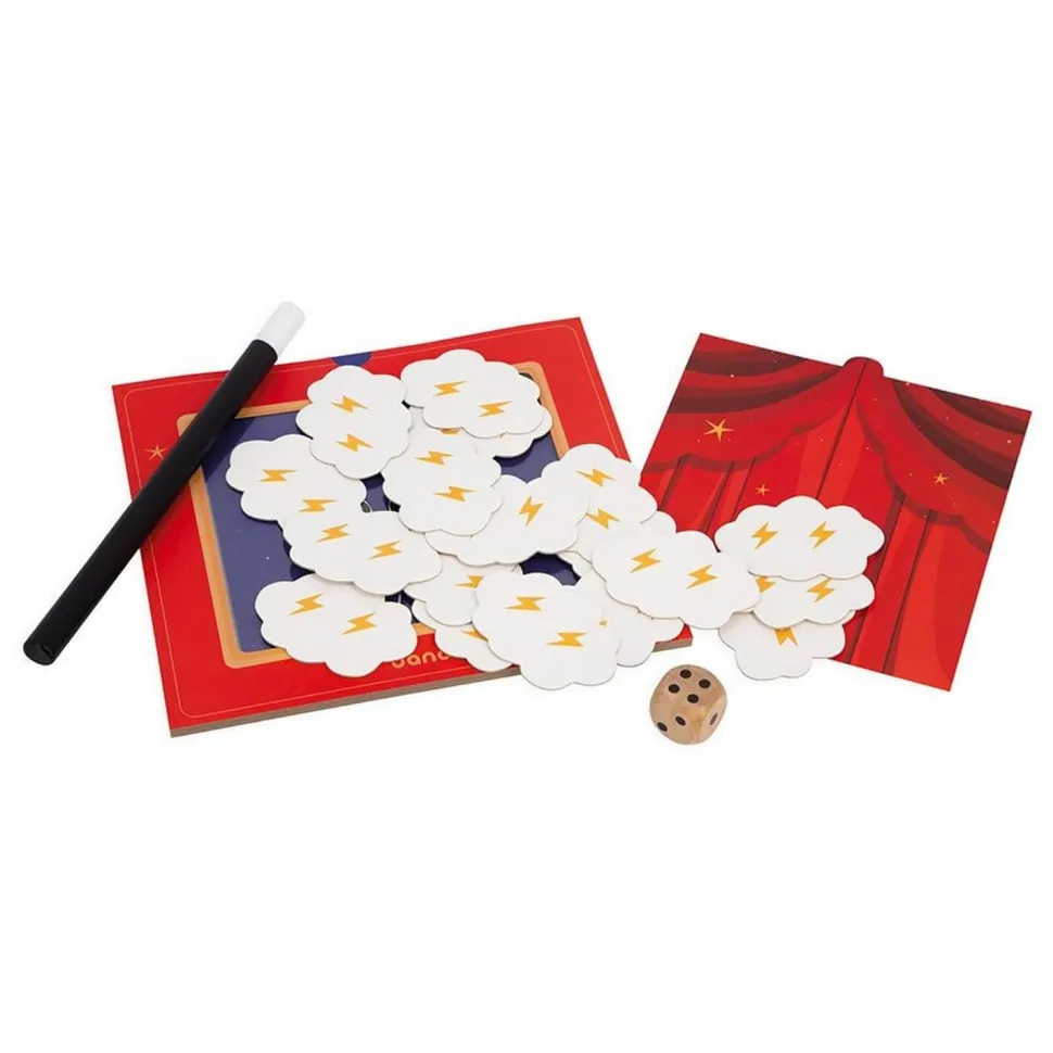 Abracadabra, petit lapin, es-tu là ? Découvrez un joli jeu de société inspiré de l’univers mystérieux de la magie ! Chaque élément du jeu est conçu avec soin pour captiver l’imagination des enfants et les immerger dans l’ambiance magique. Les nuages masquent une illustration qui a été préalablement glissée dans le théâtre. En lançant le dé et grâce à la baguette magique, les joueurs enlèvent les nuages petit à petit, chacun leur tour. L’illustration se découvre doucement … Le premier qui devine le bon animal a gagné la manche ! Ce jeu aux airs de théâtre magique, conçu pour deux joueurs ou plus, offre une expérience de jeu très originale. Les enfants apprennent à observer attentivement, à déduire à partir des indices visibles et à réagir rapidement. Ils développent ainsi leur capacité d’observation et de déduction, tout en s’amusant. Avec ce jeu de société pour enfant, chaque partie est un nouveau spectacle. Alors, êtes-vous prêt à lever le rideau et à découvrir l’animal caché derrière les nuages ?