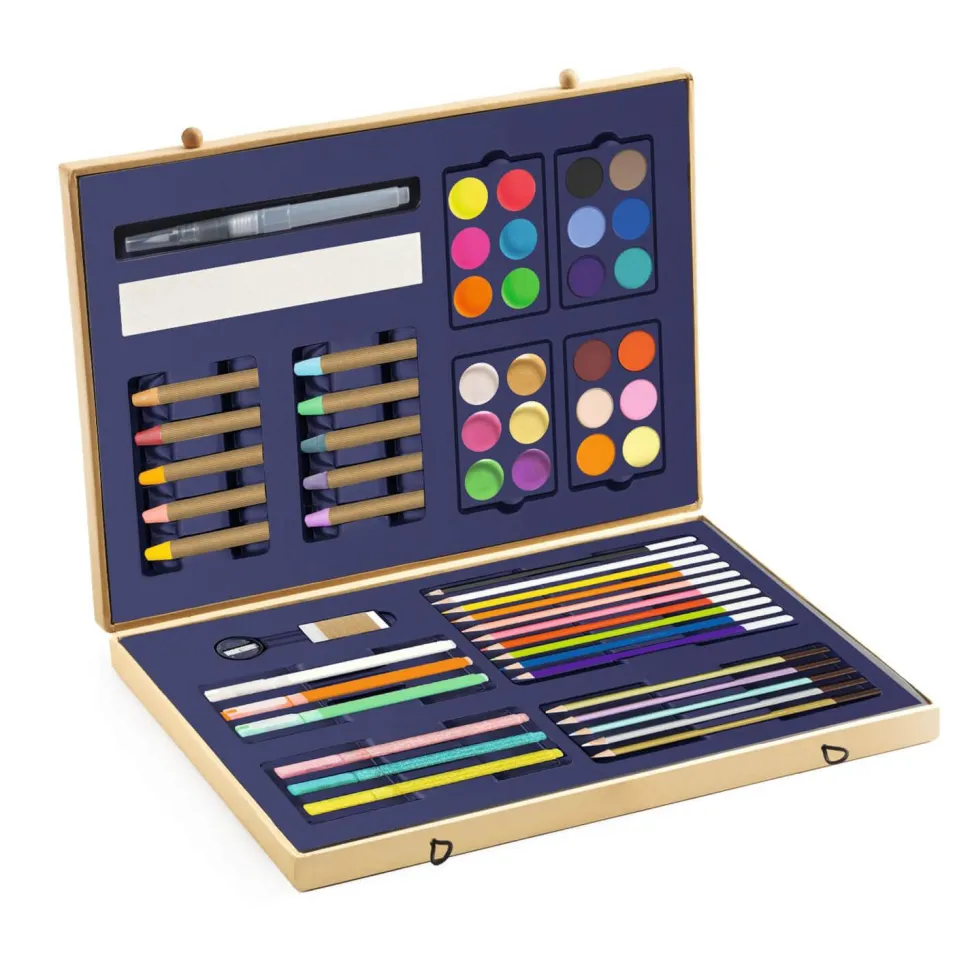 Cette riche mallette renferme un matériel de qualité et propose aux artistes en herbe de s’initier à différentes techniques.