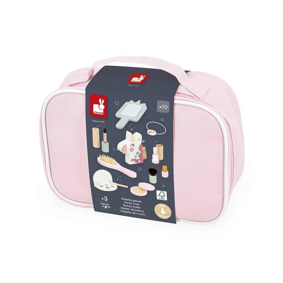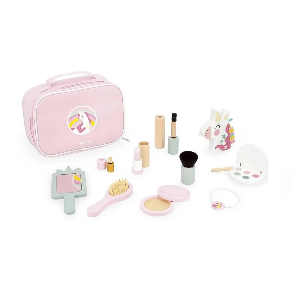 Trop drôle : la licorne tire la langue quand on appuie sur sa crinière, quelle chipie ! Tous les accessoires se rangent dans la belle mallette zippée, pour facilement les transporter et être toujours disponible pour bichonner les autres, ou soi-même. Les accessoires de maquillage en bois sont des jouets et non des cosmétiques.