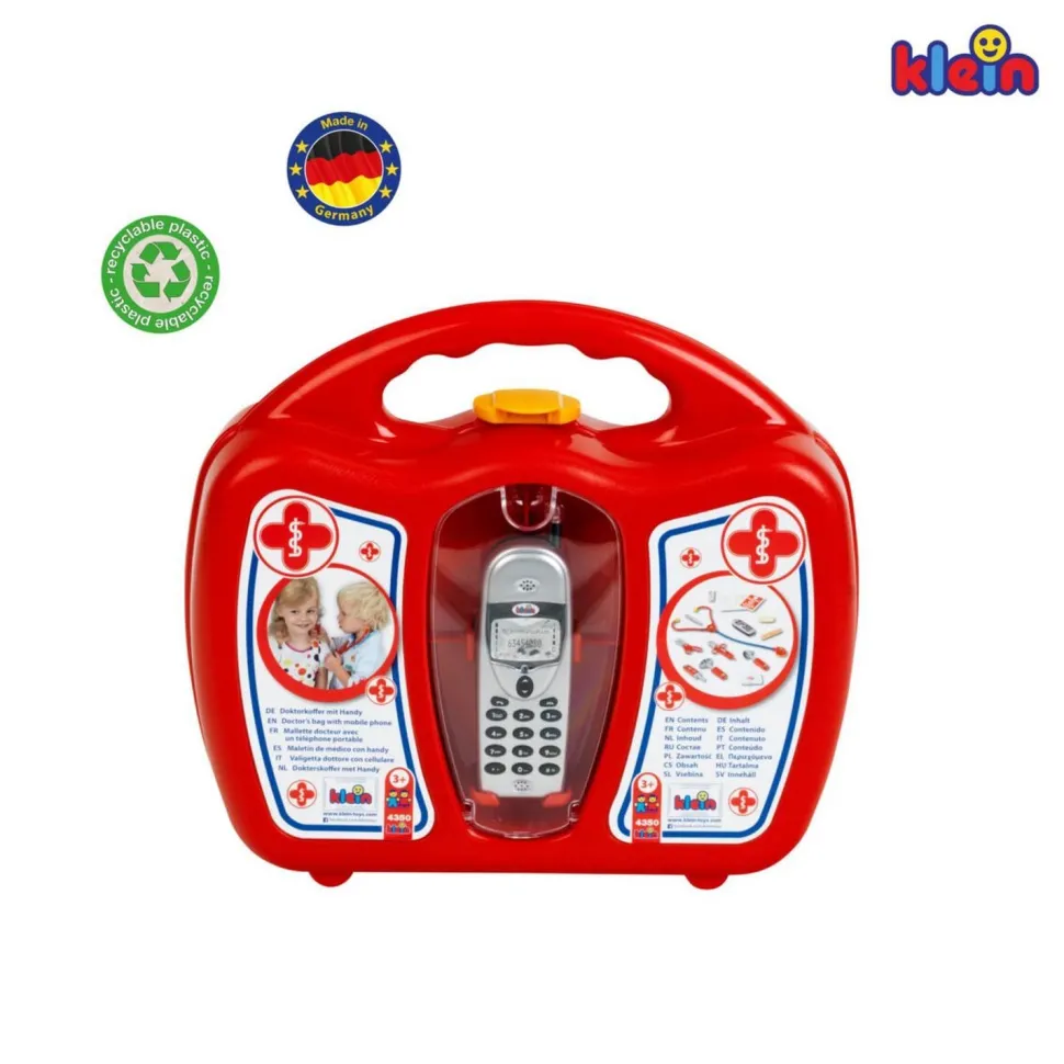 La marque Klein propose une mallette bien équipée pour parer à toutes les interventions du docteur.Le téléphone sonne !!! Le docteur répond ! Vite il y a une urgence. On lui signale une peluche malade avec beaucoup de fièvre. Avec sa superbe mallette rouge, il accourt jusqu’au malade. La mallette est très pratique à transporter et permettra à l’enfant de ne perdre aucun accessoire. Inclus dans la boîte :-Une mallette-Un téléphone portable-Un brassard-Un stéthoscope-Un otoscope-Un marteau-Une seringue-Un thermomètre-Une paire de ciseaux-Un badge-Un rouleau de pansement-Une boîte de cotonDimensions : 27 x 9.5 x 24 cm.Le portable sonne vraiment grâce à 2 piles R03 non fournies. Avec cette mallette de docteur entre les mains, il n’y aura plus aucun malade à la maison. Ce jouet est idéal pour les enfants qui aiment imiter des métiers.N’hésitez plus, et offrez cette superbe mallette très complète pour aider un enfant à soigner tout son entourage.