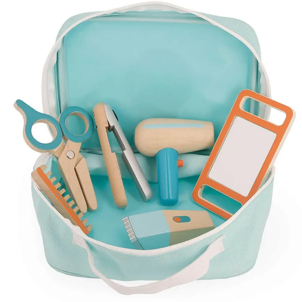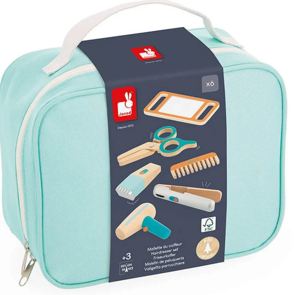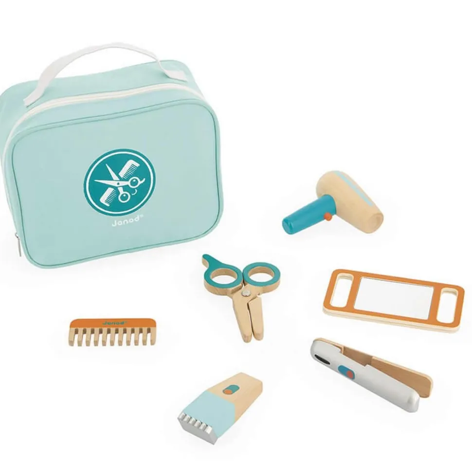 Prêt pour une nouvelle coupe de cheveux ? Avec ce coffret de coiffure complet, votre enfant va faire des miracle sur votre style ! Dans sa petite mallette transportable en tissu, il aura tout le nécessaire pour exercer ses talents de coiffeur ou de barbier : Un peigne, un sèche-cheveux, une tondeuse, des ciseaux, un lisseur et l’indispensable miroir pour partager son œuvre avec le client du jour !