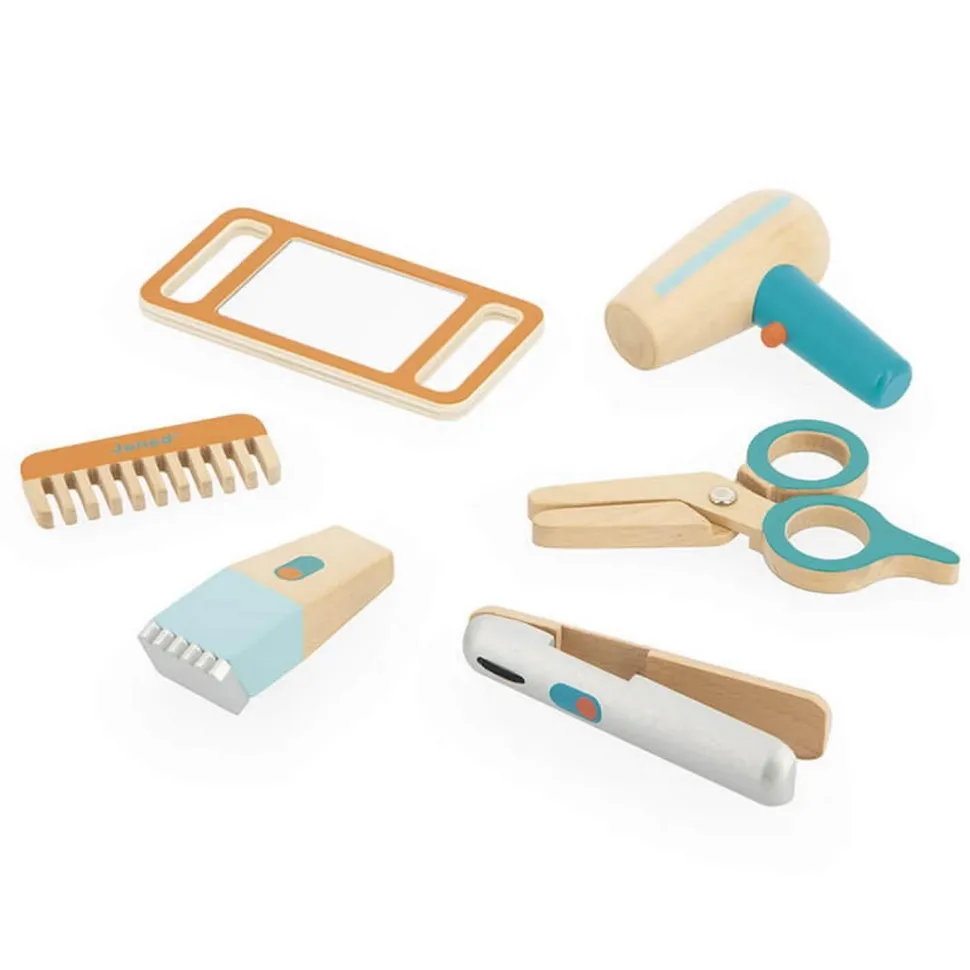 Tous ces accessoires sont en bois FSC® (bois issus de forêt gérées durablement) et laisse apparaitre la couleur naturelle de celui-ci. On craque également sur le design soigné et les couleurs de ce kit du parfait petit coiffeur dans des tons bleus / orangés (peinture à l’eau) assortis à la trousse bleue ciel.