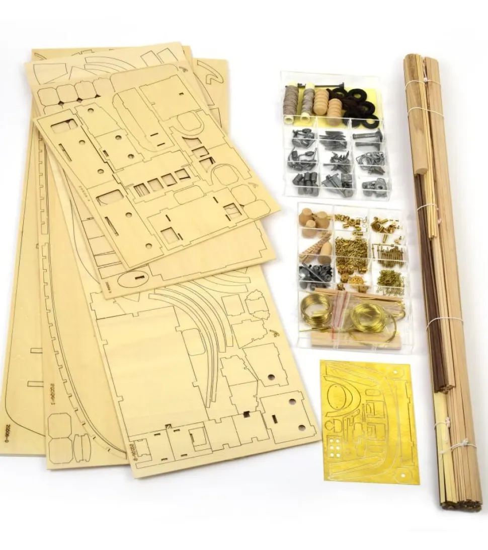 Le kit de modélisme contient toutes les pièces nécessaires à la construction du modèle : pièces de planche découpées au laser de haute précision, entièrement numérotées et avec leurs mesures pour une identification rapide, de nouvelles pièces photodécoupées pour les détails, de nouveaux autocollants avec le nom et les plaques d’immatriculation de Santander, Saint-Sébastien et Bayonne -France- et des fils. Il s’agit d’une réplique miniature fidèle avec de nombreux détails qui éblouiront les modélistes qui la construiront. De plus, une base en bois est désormais incluse pour exposer le modèle une fois assemblé.