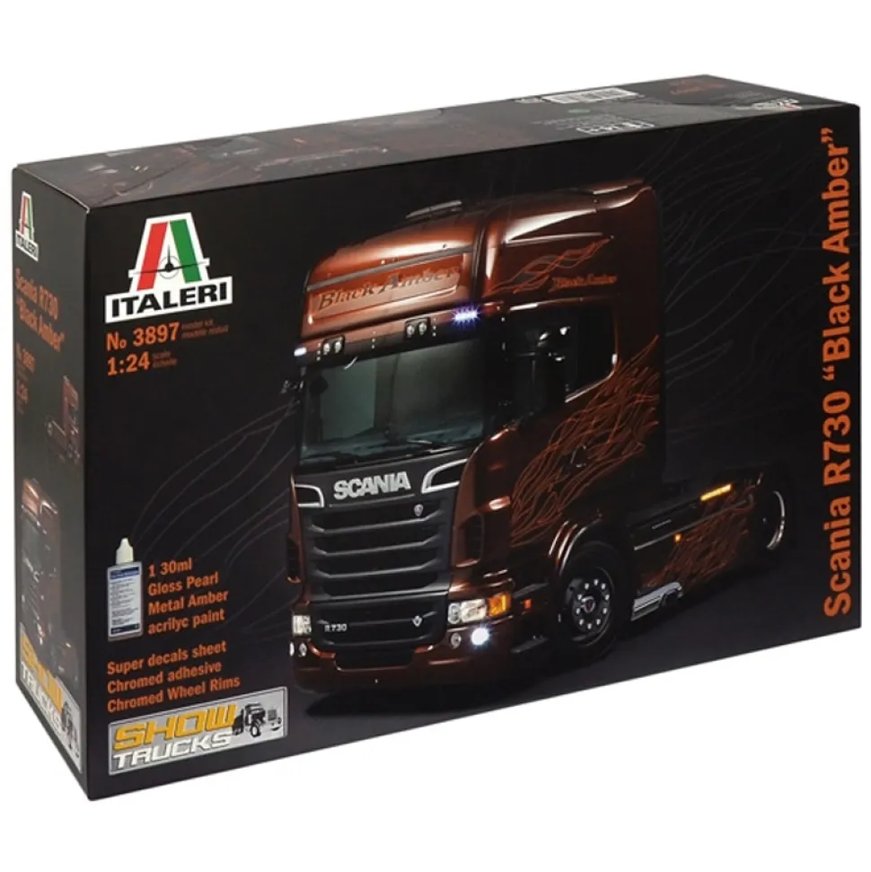 Maquette de camion en plastique à assembler.Cette version Show Truck du Scania R730 propose des décorations spécifiques en decals, des stickers métalliques et des jantes chromées.Inclus : un flacon de 30ml de la teinte de carrosserie authentique Gloss Pearl Metal Amber. Niveau de difficulté : 5.Longueur du modèle assemblé : 24.7 cm. Dimensions de la boîte : 37.5 x 24 x 12 cm. Peintures recommandées : – Argent brillant- Noir brillant- Orange brillant- Rouge brillant