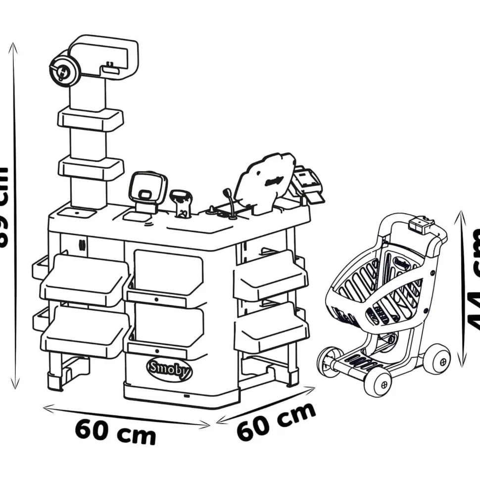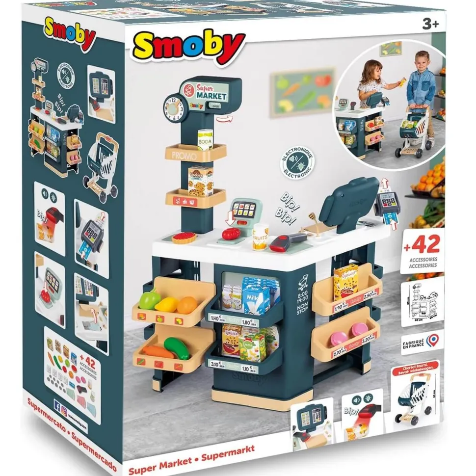 Prêt à jouer au marchand et à la marchande avec ta marchande Super Market de la marque Smoby ? Que ce soit en tant que client ou vendeur, tu auras tous les accessoires nécessaires pour jouer pendant des heures … Parcours les étalages en poussant ton chariot et choisis tes produits parmi les nombreux aliments proposés.