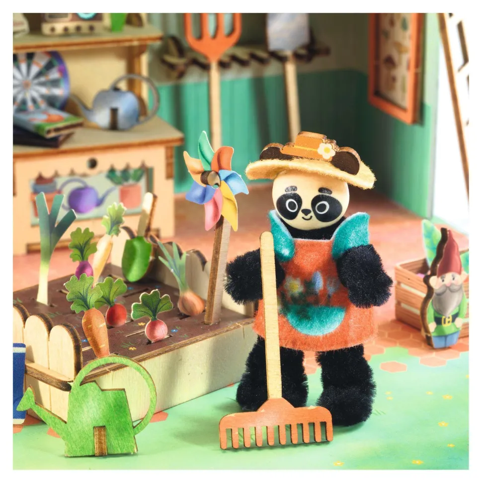 Contenu : 1 petite maison (dimension fermée : 14,5 x 16,5 x 5 cm), 2 planches en bois lasérisé, 1 palette de peintures sèches et 1 pinceau, 1 nappe de protection, 3 planches de carte prédécoupée illustrée, 3 planches de stickers (1 planche de stickers illustrés, 1 planche de petites gommettes transparentes, 1 planche de stickers double face en mousse), 4 fils chenille, 1 tête et des oreilles illustrées en bois, 1 bobine de fil, 1 planche de feutrine illustrée préd