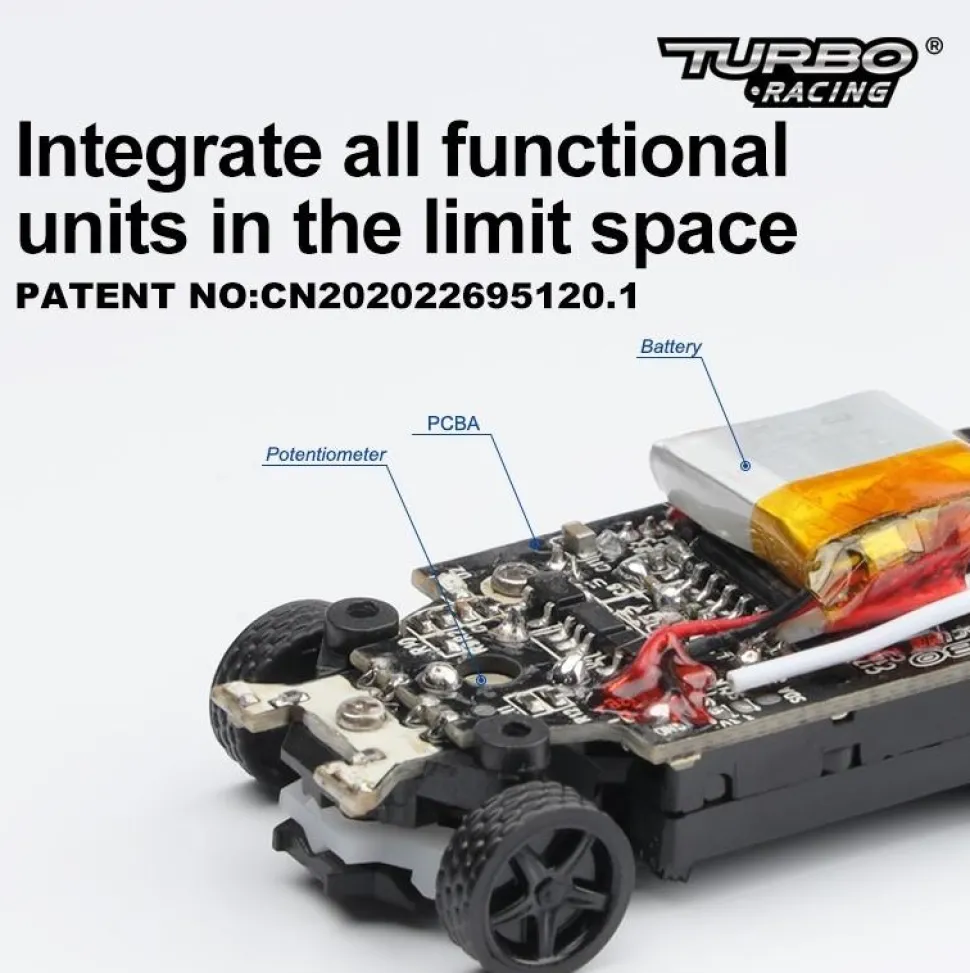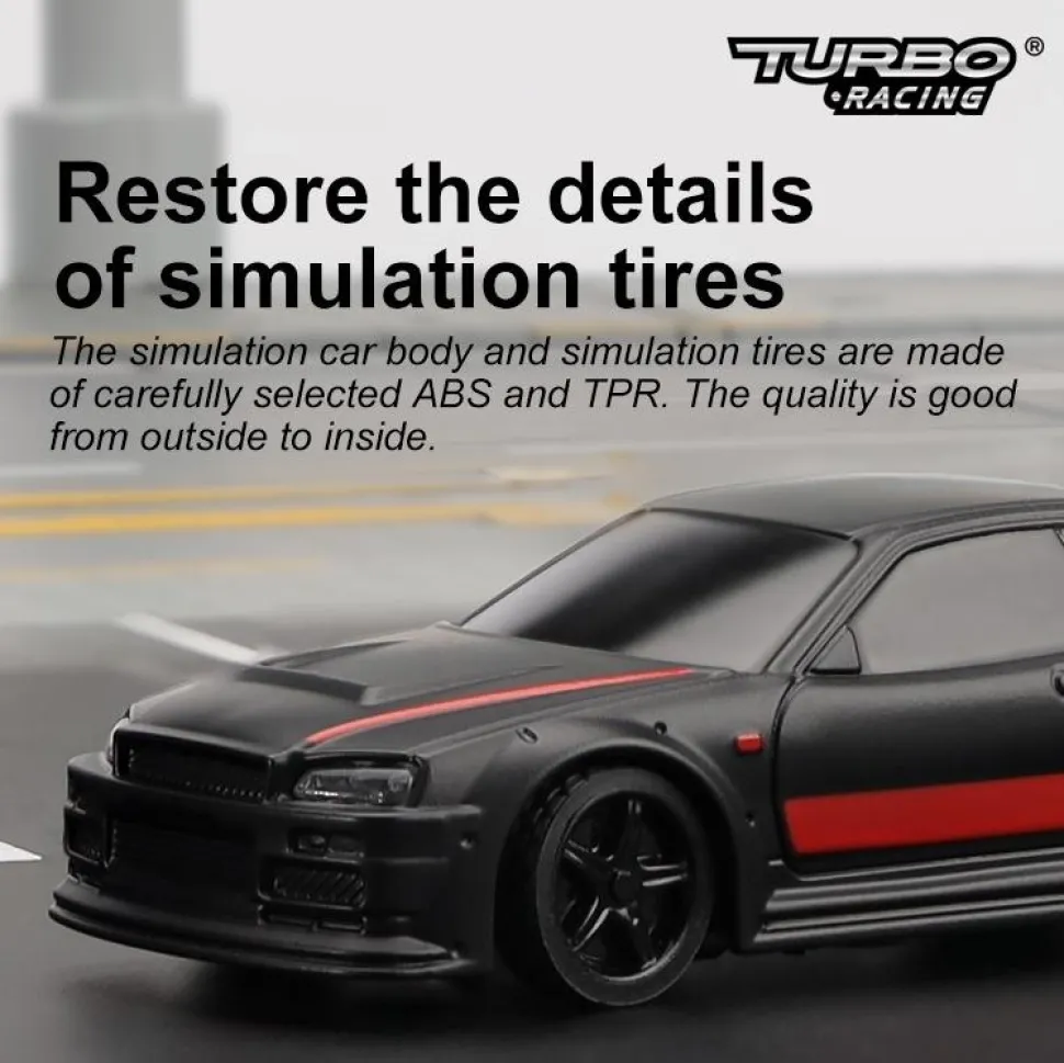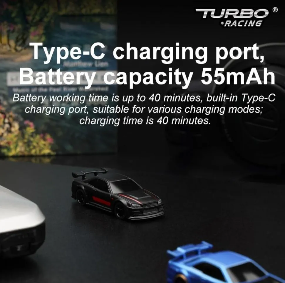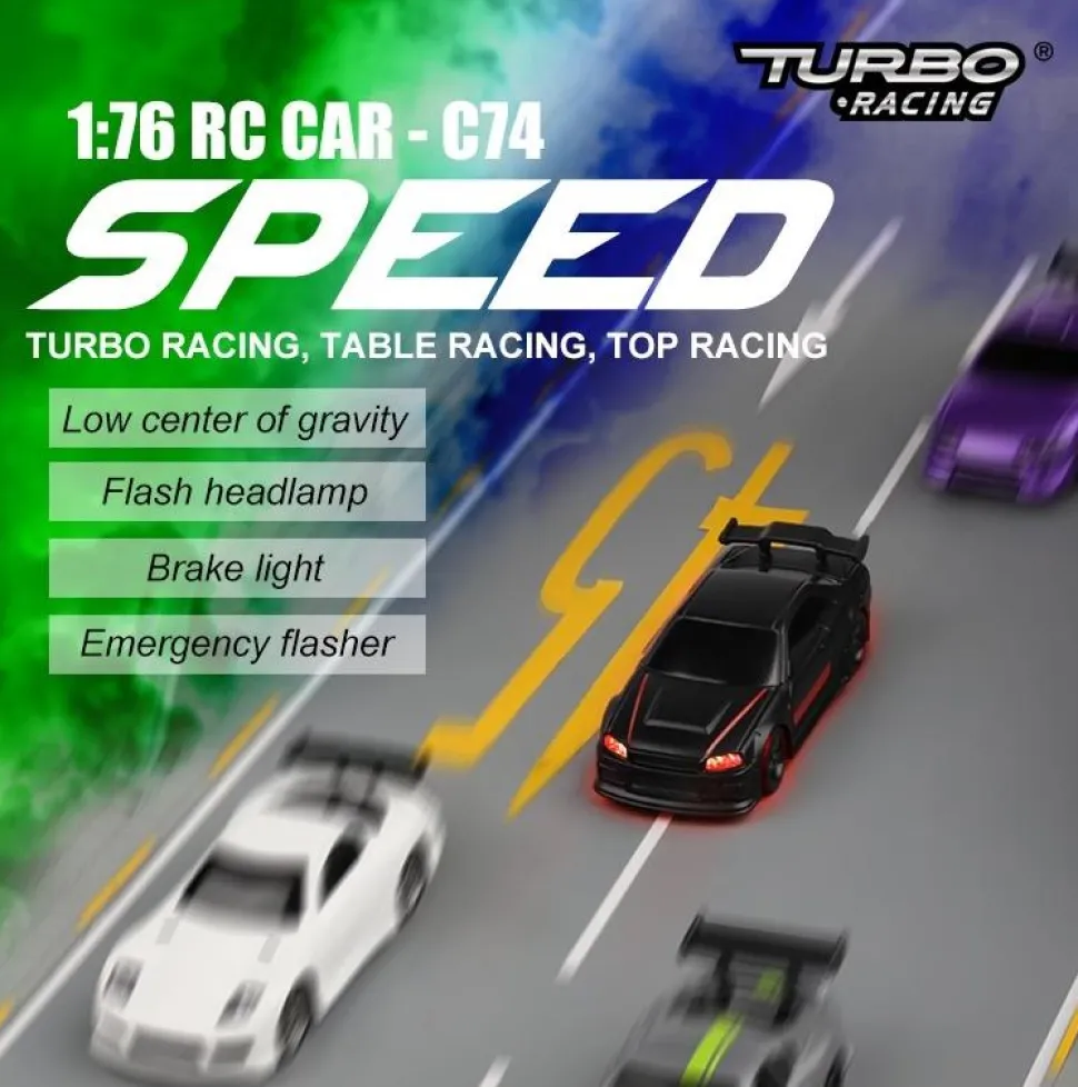 La Turbo Racing est une micro voiture RC au 1/76ème (elle tient sur un pouce de la main). Les commandes sont entièrement proportionnelles et similaires à des modèles de plus grandes échelles. La conduite est bluffante et accessible à tous (néophytes ou modélistes avertis). L’autonomie des voitures est de 40 minutes et la recharge se fait via une prise USB-C qui se trouve sous la voiture. Les Turbo Racing sont des voitures extrêmement fiables et il y a rarement de la casse. On peut rouler sur une table ou un plan de travail. Pour le tracé, il existe des pistes/tapis de différentes tailles mais on peut également envisager de construire et de décorer sa propre piste à la manière d’un train miniature (maquette de bâtiments, végétation, flocage…).