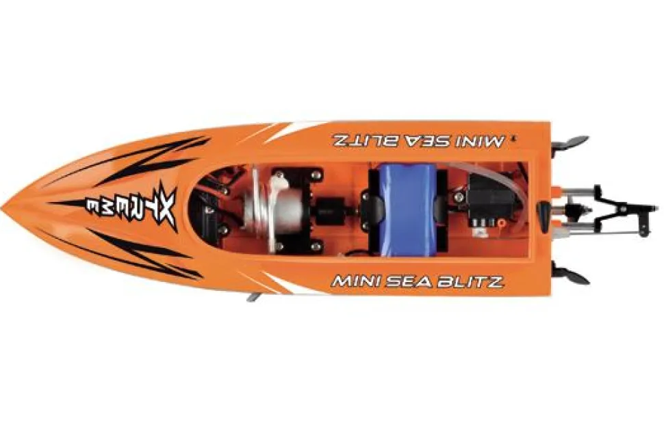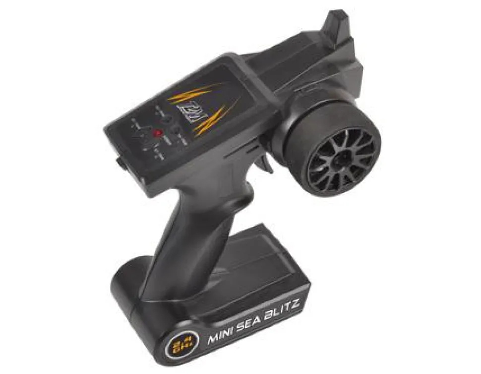 Racer offshore prêt à naviguer, le Mini Sea Blitz se pilote au moyen d’une radiocommande 2,4 GHz avec émetteur type volant/gâchette d’une portée de 100 mètres.Contenu :- bateau Mini Sea Blitz RTT- émetteur 2.4GHz- pack d’accus LiFe 600mAh- chargeur USB- hélice de rechange- manuel d’utilisation en françaisSa coque effilée, son puissant moteur électrique et son hélice haut rendement lui permettent d’atteindre 25km/heure.Le design anti-retournement permet au bateau de toujours se remettre à l’endroit. Son gouvernail à activation directe assure des changements de direction vifs et précis.Caractéristiques techniques :- Coque étanche en matière plastique teintée dans la masse- Combiné récepteur/variateur compact dans un compartiment étanche- Fonctions : marche avant/marche arrière, gauche/droite- Puissant moteur électrique type 370- Refroidissement par eau- Servo de direction- Stabilisateurs latéraux- Hélice haut rendement- Chargeur USB- Emetteur 2.4GHz de type volant à gâchette ergonomique- Portée jusqu’à 100 mètres- Avertisseur sonore de faible signal radio- Avertisseur sonore de tension de pack d’accus faible- Pack d’accus LiFe 600mAhUn dispositif de sécurité empêche la rotation de l’hélice lorsque le modèle est hors de l’eau.Dimensions du Mini Sea Blitz :- Longueur : 325 mm- Largeur : 89 mm- Hauteur : 88 mm- Poids : 310gNécessite 4 piles alcalines 1,5V AA pour l’émetteur (non fournies)