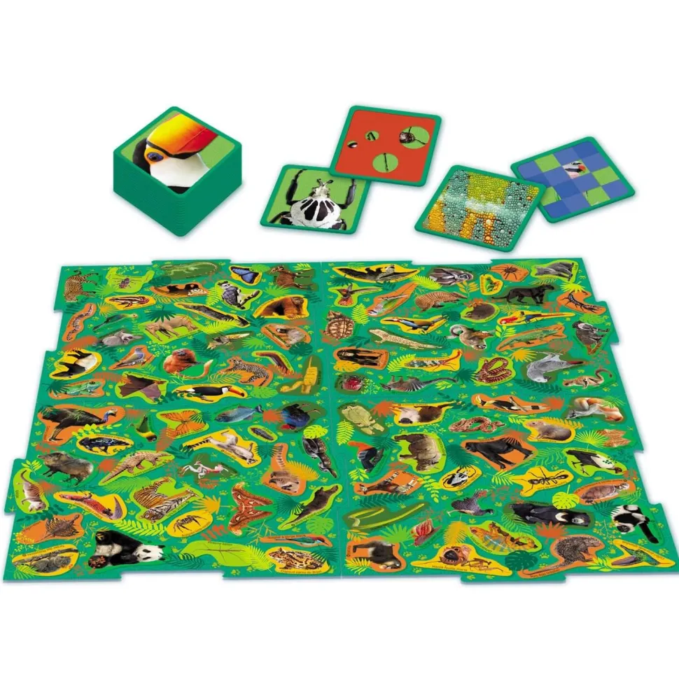 Des défis d’observation pour devenir imbattable sur les animaux de la jungle ! Pars à la découverte des animaux tropicaux : insectes, poissons, reptiles, oiseaux, mammifères… Des règles simples adaptées aux plus jeunes comme aux plus grands. Pour gagner, sois le plus rapide à retrouver les animaux sur le plateau ! Le plus rapide gagne la carte, et ainsi de suite. Avec son design coloré, ses photos d’une bonne qualité et ses différents petits pièges avec des ressemblances sur le plateau, munissez-vous d’un œil de lynx afin de ressortir vainqueur de la partie ! Alors, qui sera le meilleur observateur et remportera la partie ? Place au jeu et que le meilleur gagne !