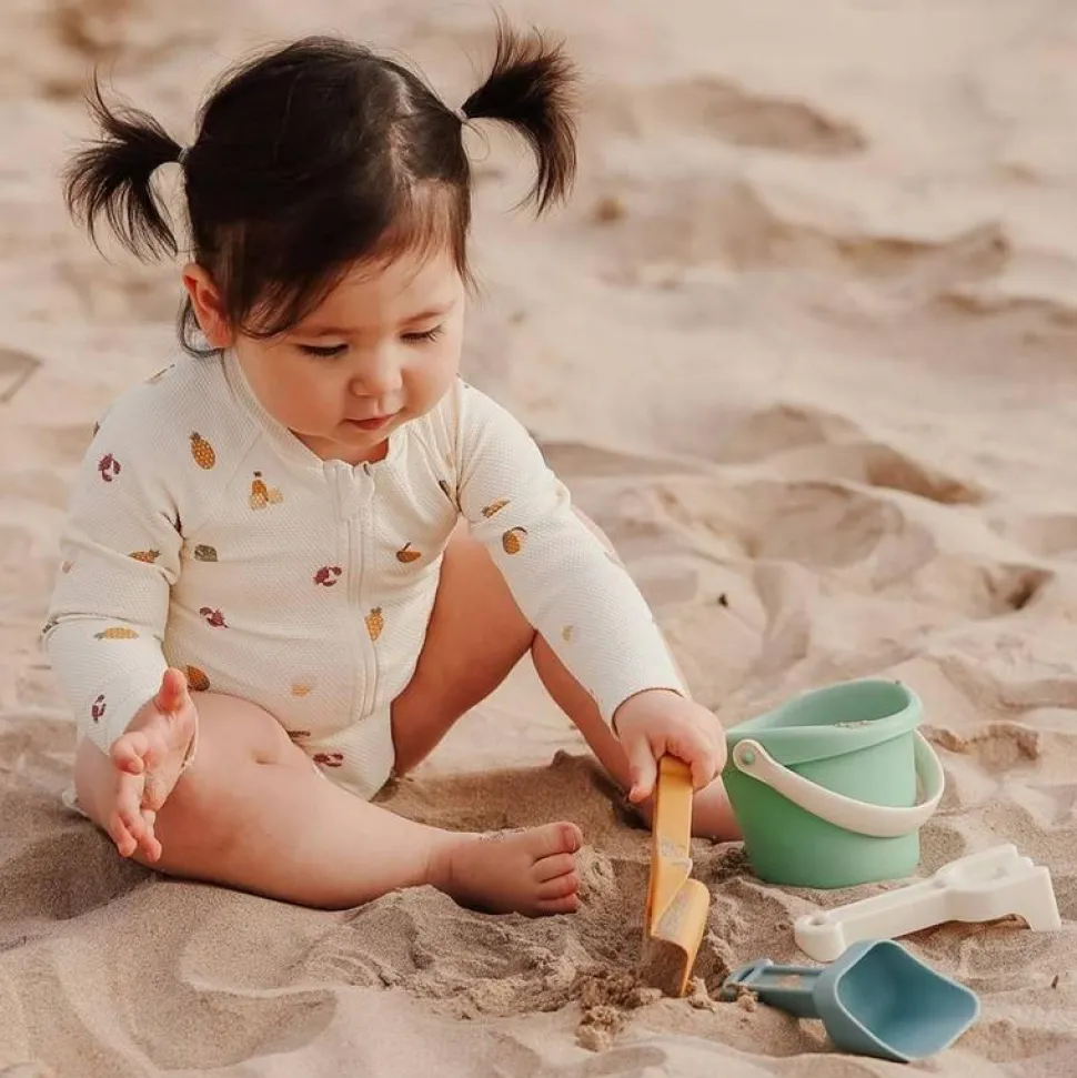 Un lot de 4 équipements spécialement conçus pour les tout-petits afin de s’amuser à creuser, transporter et modeler le sable en extérieur. Ce set comprend une pelle adaptée aux petites mains, idéale pour creuser de petits trous ou remplir le seau sans difficulté, un râteau pour lisser le sable et dessiner des motifs simples, un seau compact mesurant 10 cm de hauteur et 13 cm de diamètre, parfait pour transporter facilement le sable ou l’eau, ainsi qu’un scoop, une petite pelle creuse idéale pour transvaser du sable et réaliser des détails amusants dans ses créations. Les jouets de plage et d’extérieur de Miniland, aux tons doux et apaisants inspirés du design scandinave, sont fabriqués à partir de plastique recyclé et de bioplastique. Un ensemble parfaitement adapté aux premières expériences de jeux dans le sable, favorisant l’imagination et le plaisir de construire.