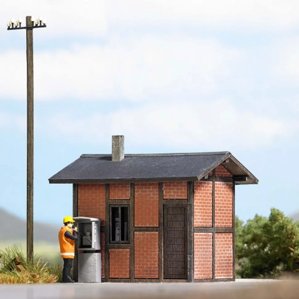 Assemblez cet abri pour agents de triageAbri de construction mixte colombage en bois/briques. Colombage, fenêtres et portes en bois véritable déjà colorié.Échelle : 1:87Dimensions : 52 x 43 x 49 mmDestiné aux personnes de plus de 14 ans