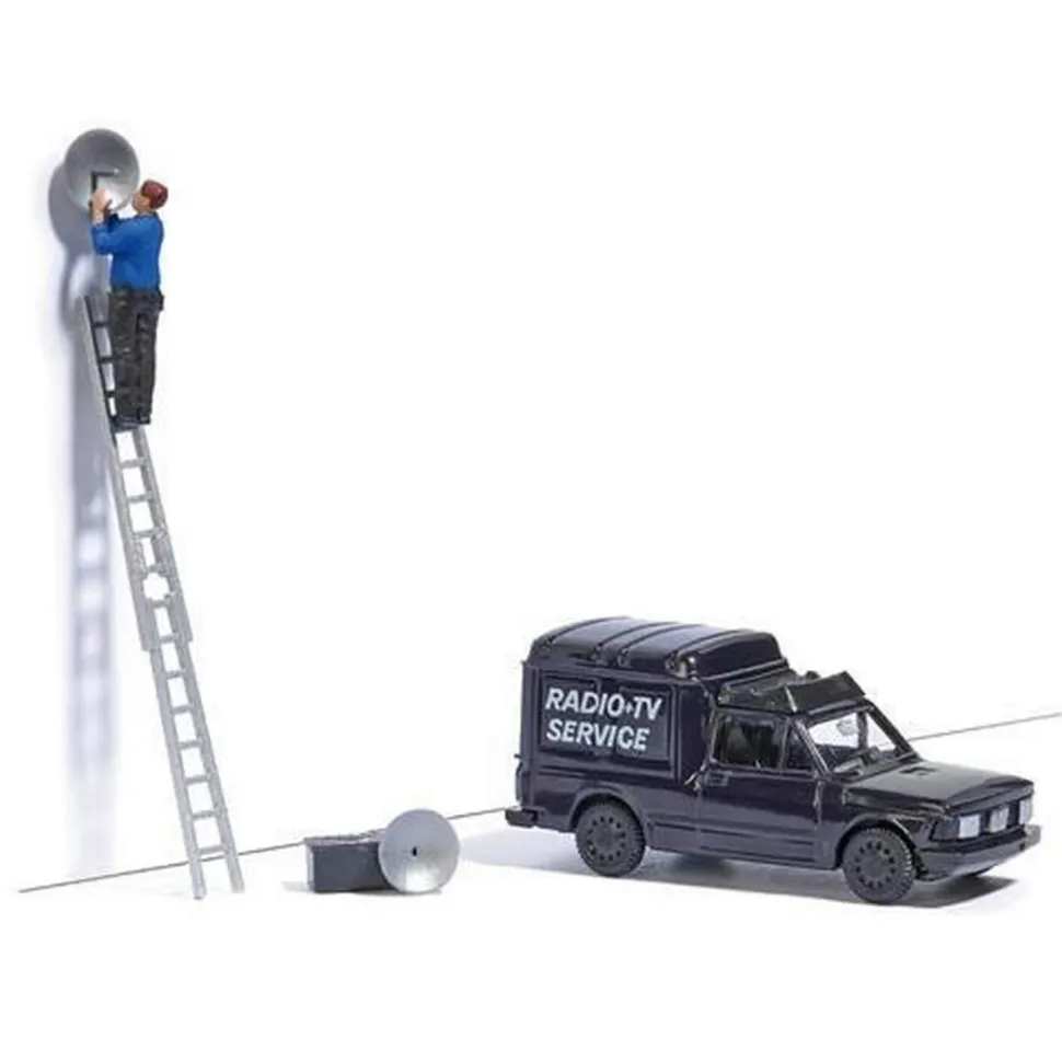 Diorama Réglage d’antenne parabolique de la gamme Action Set de Busch, pour modélisme HO (1/87).