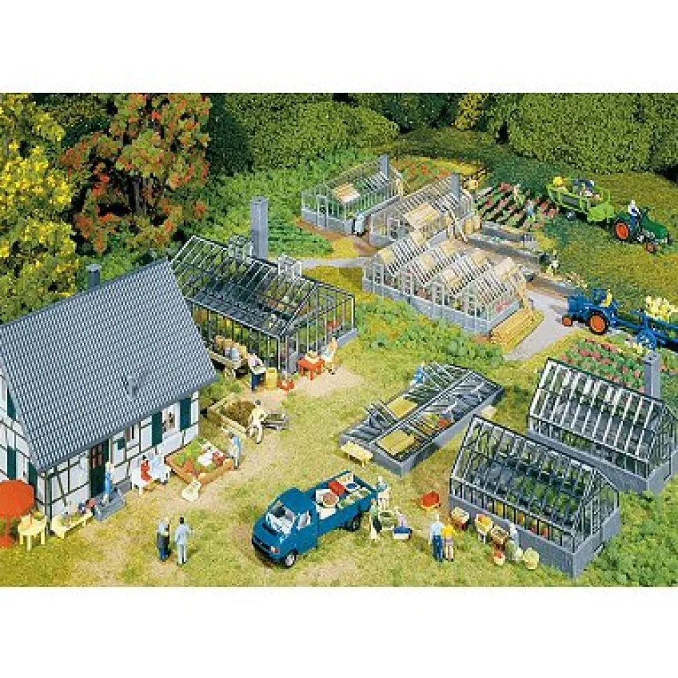 Avec maison d’habitation, 3 serres en verre, 2 carrés, nattes de paille de couverture et accessoires. Extensible avec l’article Faller-130213.Epoque : 1921 – 1945.Degré de difficultés : débutant.Dimensions maison d’habitation : 11 x 6.8 x 6.7 cm.Dimensions installation de serre 1 : 9.3 x 8.4 x 10.7 cm.Dimensions installation de serre 2 : 7.1 x 4.2 x 6.3 cm.Dimensions carré : 9 x 2.1 x 1 cm.Nombre de pièces : 130.