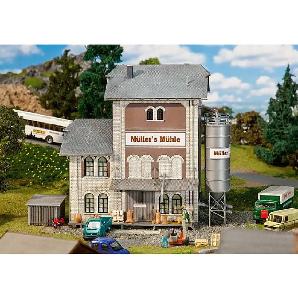 Sillos à céréales industriels constitués de bâtiments principaux, bâtiments latéraux et d’une zone de silos. Le déchargement se fait par un manchon de remplissage sur un quai de départ couvert d’un bâtiment en briques claires. Les palettes et sacs de farine font aussi partie des accessoires.Ce kit de montage contient: 298 pièces détachées dans 10 couleurs, feuille pour fenêtre, 1 masque, 1 déco et 1 notice de montage.Utilisez pour le bricolage FALLER – colle plastique.Degré de difficulté : Standard.Epoque : 1946 – 1977.Dimensions : 20.5 x 15.8 x 19 cm.Echelle HO = 1/87.