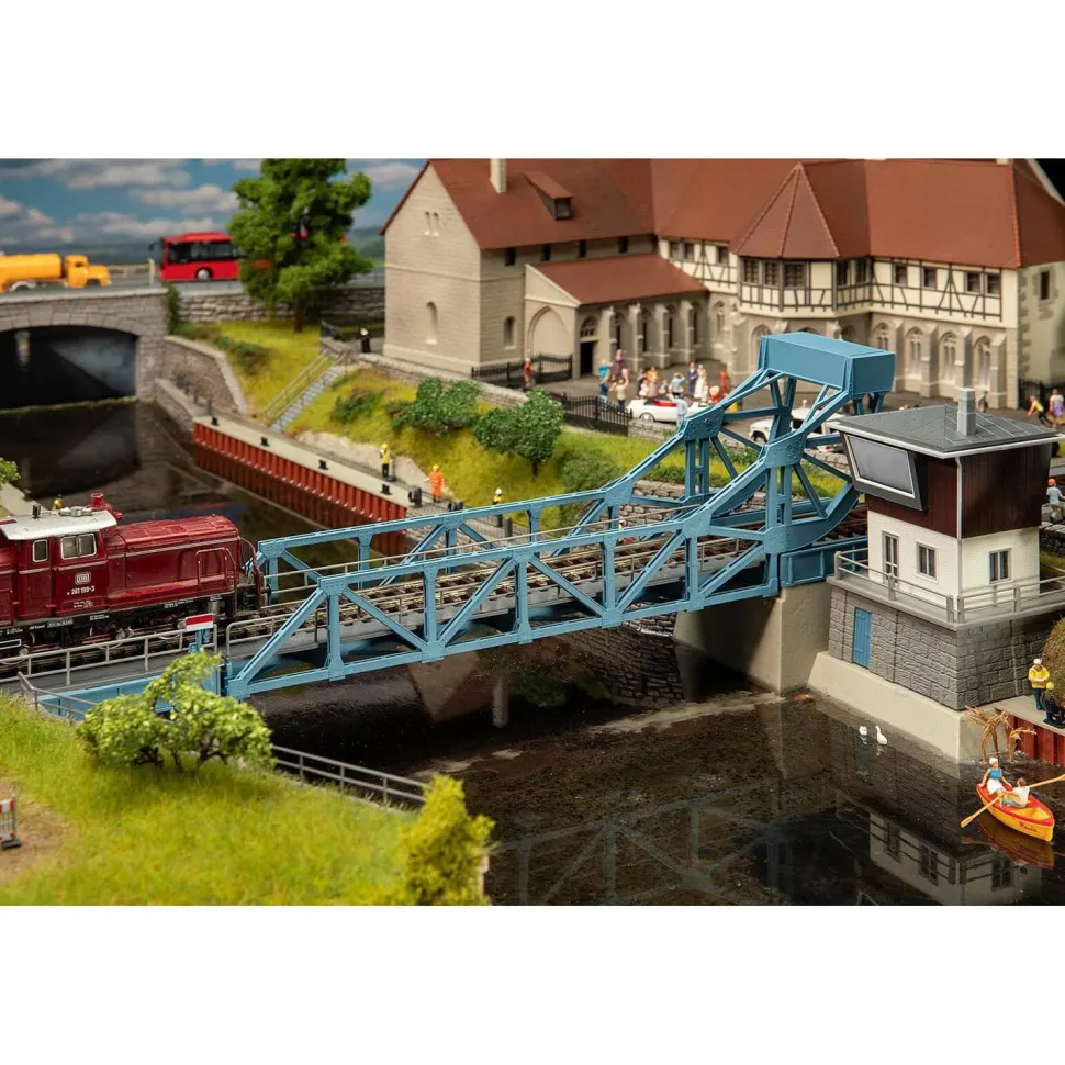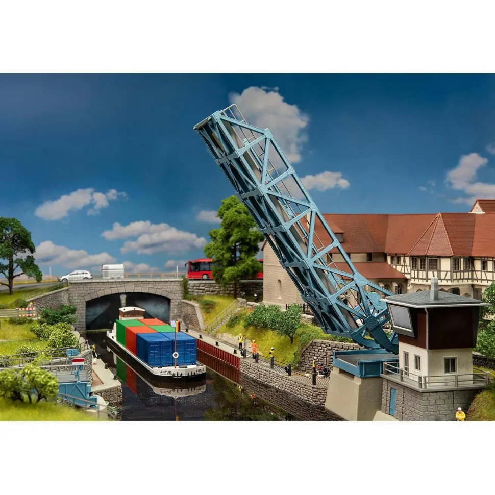 Le pont basculant fonctionnel invite à faire passer le trafic ferroviaire ou les véhicules Car System au-dessus d’un paysage fluvial, que ce soit en ville ou à la campagne. Dans le grand modèle, un pont basculant n’est pas tiré vers le haut par des câbles ou des chaînes, mais est déplacé par le déplacement de poids. En règle générale, ce poids ne se trouve pas au-dessus de la poutre du pont, mais derrière son axe de rotation, exactement comme dans le modèle réduit. Le kit comprend un motoréducteur (raccordement à une tension alternative de 16 V), une commande et des interrupteurs de fin de course, ainsi que des rails.