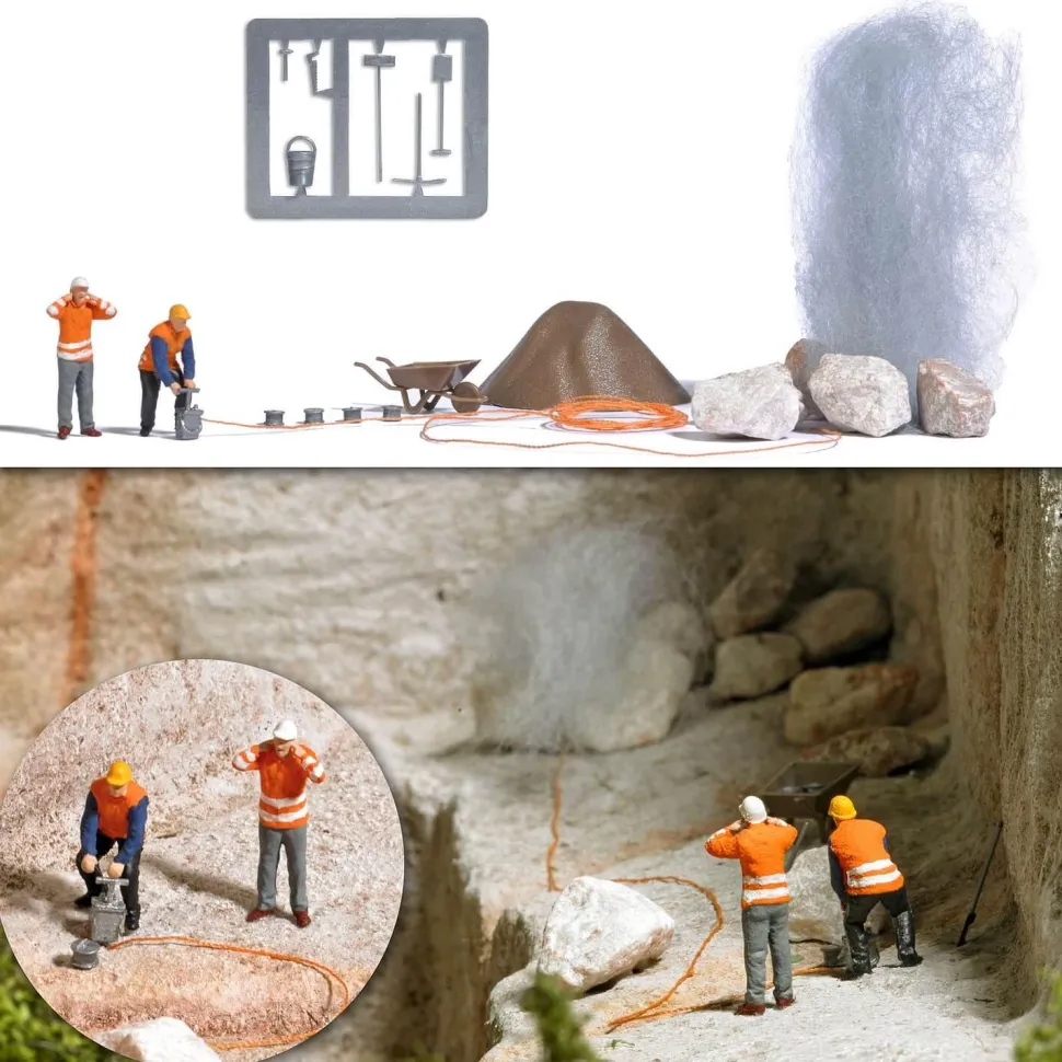 Le set comprend : Un artificier avec appareil détonateur, déclenchant un dynamitage, et unouvrier se bouchant les oreilles. Avec outils, brouette, rochers, câbles, filets de fumée et tas de sable.
