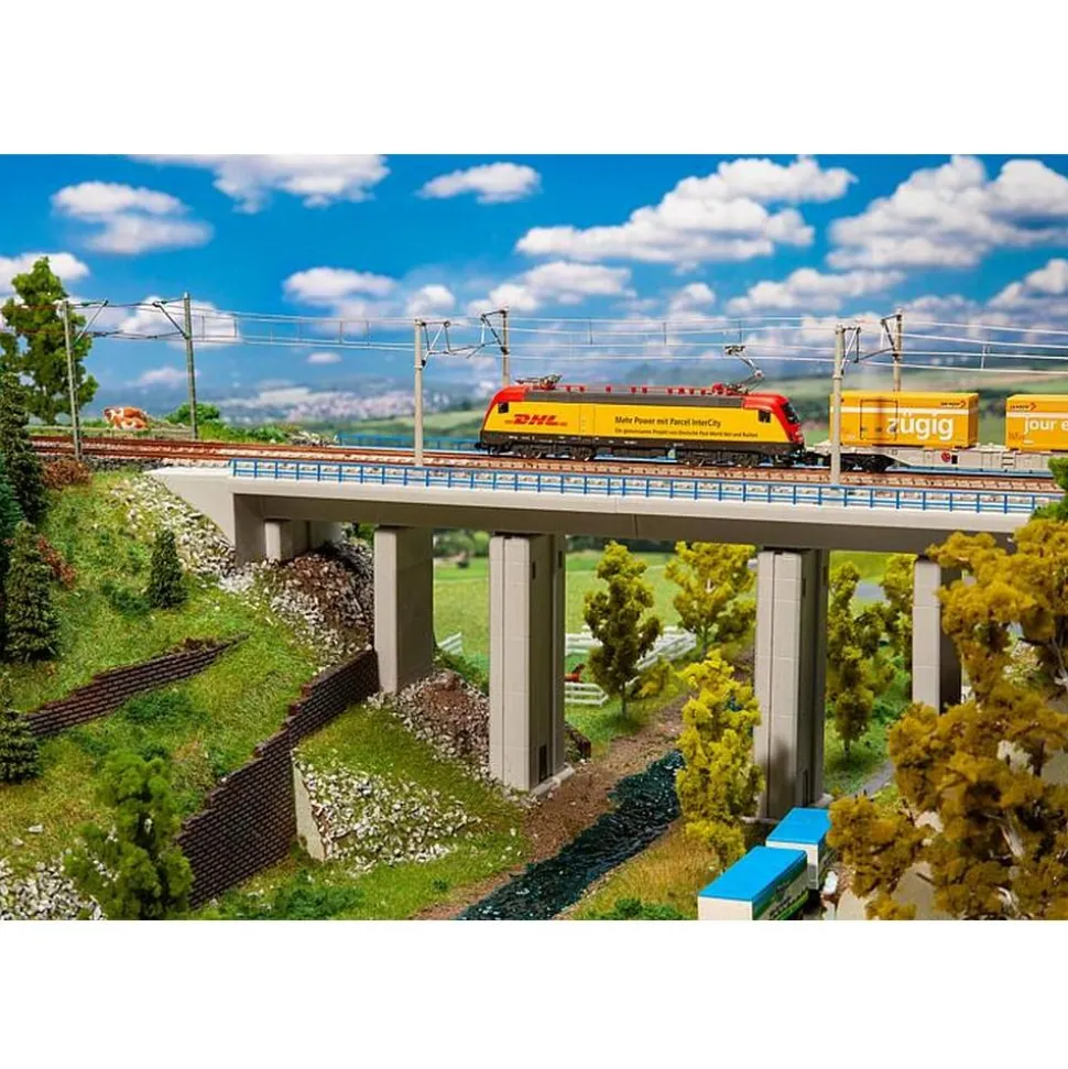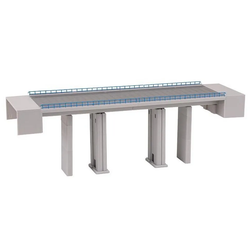 Pont de chemin de fer moderne en béton avec quatre piles et culées. Permet le passage sur 2 voies, avec toutes les voies de modélisme. Combinable avec le modèle »Pont en arc moderne«, Art. 222573. Ce kit de montage contient: 162 pièces détachées dans 4 couleurs et 1 notice de montage.