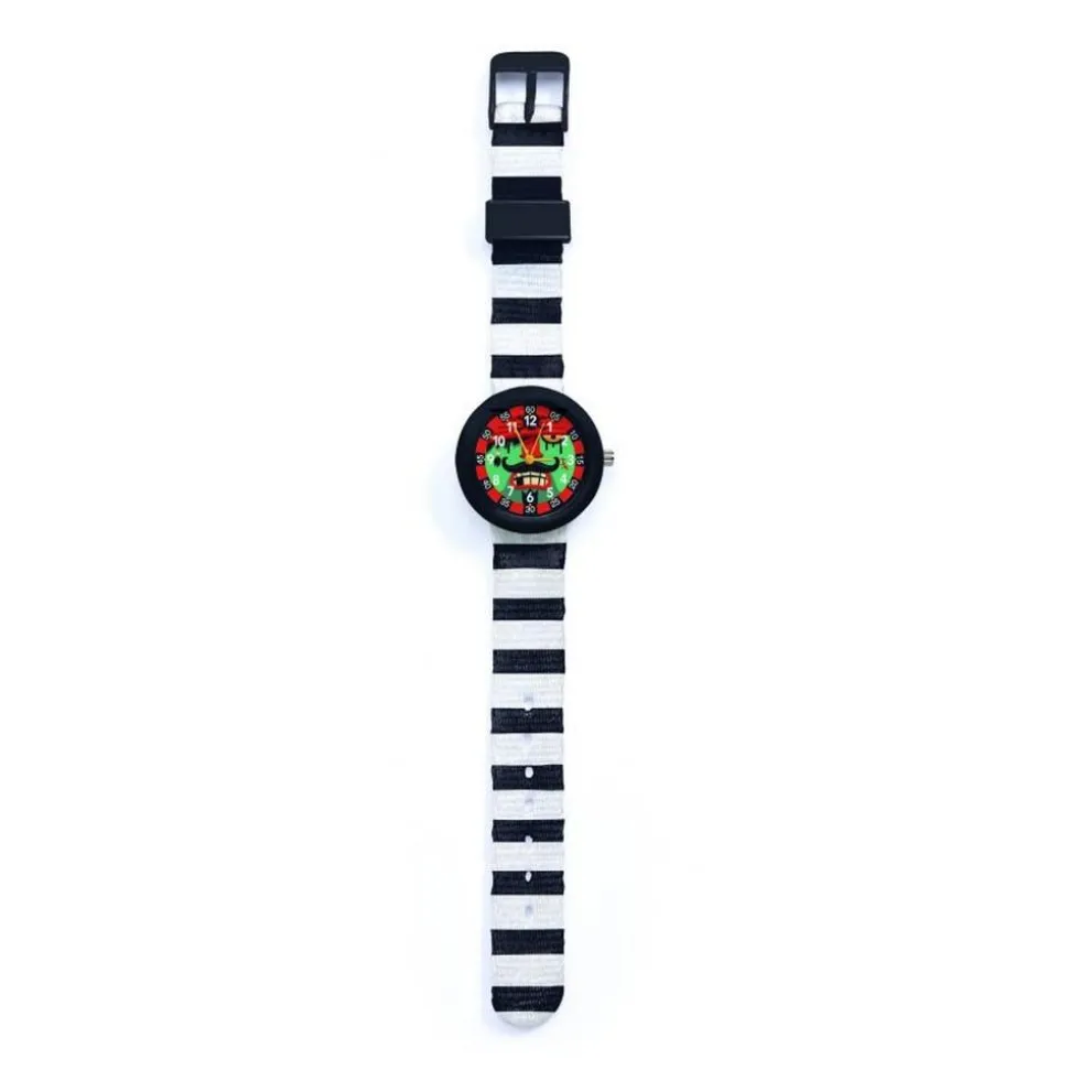 Une montre élégante et chic pour apprendre à lire l’heure en s’amusant. De couleur noire et blanche sur le bracelet, vous allez beaucoup apprécié son cadran représentant une tête d’un pirate. Votre enfant appréciera la douceur de son bracelet en polyester et la réglera facilement à son poignet avec la fermeture par boucle ardillon. Les chiffres des heures et des minutes sont facilement lisibles grâce au contraste de couleurs. La montre possède trois aiguilles, celle indiquant les heures, celle des minutes, mais également la trotteuse qui indique les secondes pour faciliter l’apprentissage.
