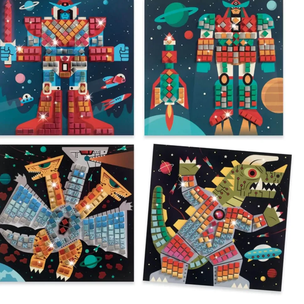 Initiez-vous à l’art de la mosaïque avec ce coffret sur le thème de l’espace où des robots affrontent de terribles monstres !
