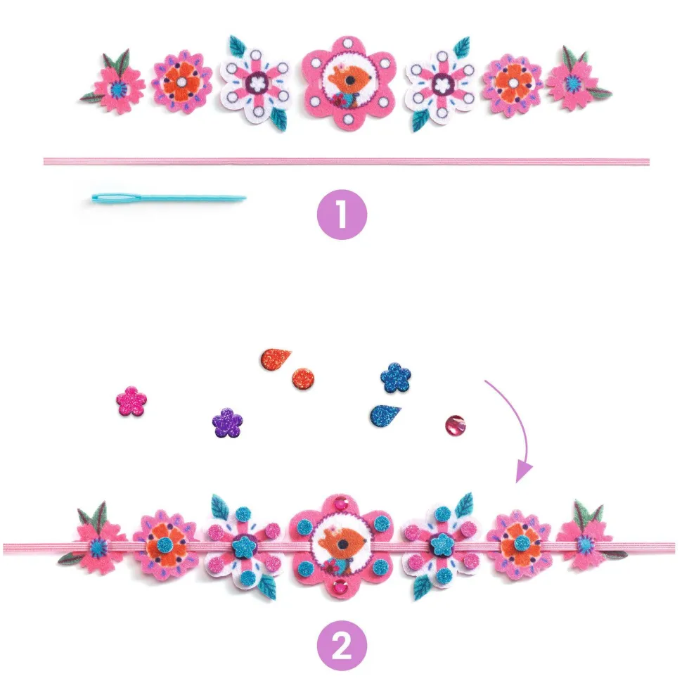 Contenu : 28 pièces prépercées en feutrine (7 pièces par bracelet), 4 élastiques en tissu, 4 planches de stickers en mousse pailletée, 1 planche de pierres précieuses autocollantes, 4 aiguilles à bout rond, 1 pas-à-pas général et 4 modèles à suivre pour chaque bracelet.