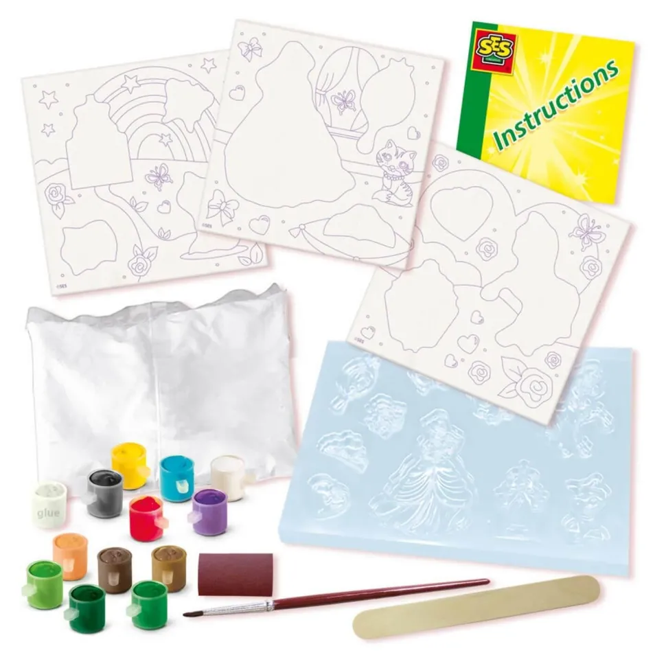 Contenu : 3 toiles thème princesse, Plâtre, Moule avec différentes formes, 12 couleurs de peinture, Pinceau, Peigne à lisser, Papier de verre, Instructions.