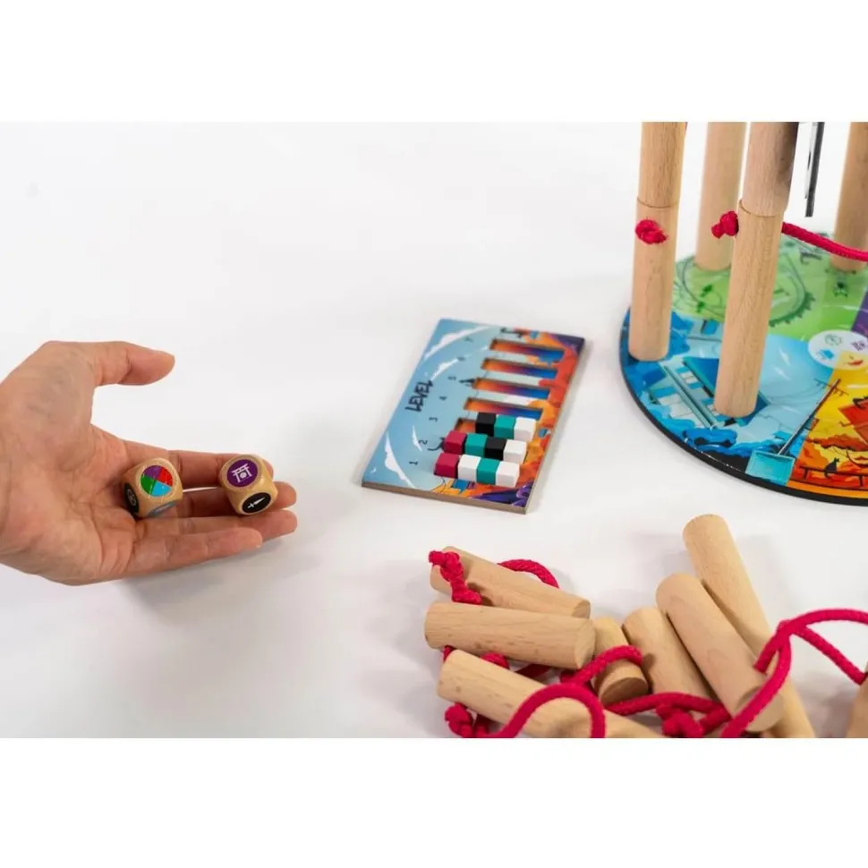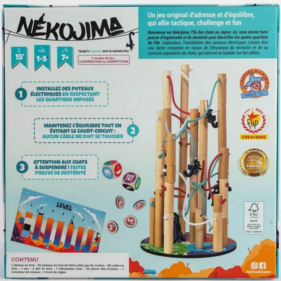 Nekojima est un jeu d’adresse en bois exigeant, qui mettra à l’épreuve votre habileté et votre sang froid. L’objectif est de maintenir en équilibre des poteaux électriques, en veillant à ce qu’aucun câble ne se touche. Mais attention vous n’aurez ni le choix de l’emplacement ni celui de leur taille. En mode compétition, celui qui fait basculer la structure est éliminé du jeu. En mode coopération, le but est de collaborer pour avancer aussi loin que possible sans que l’ensemble ne s’effondre. Il s’agit d’un défi qui sollicite à la fois de la coordination et de la précision, que vous jouiez en solo ou en équipe. Préparez-vous à mettre vos compétences à l’épreuve et à vivre des moments palpitants avec Nekojima !
