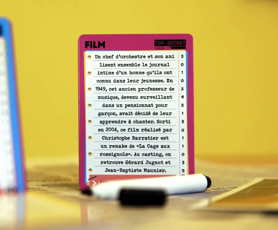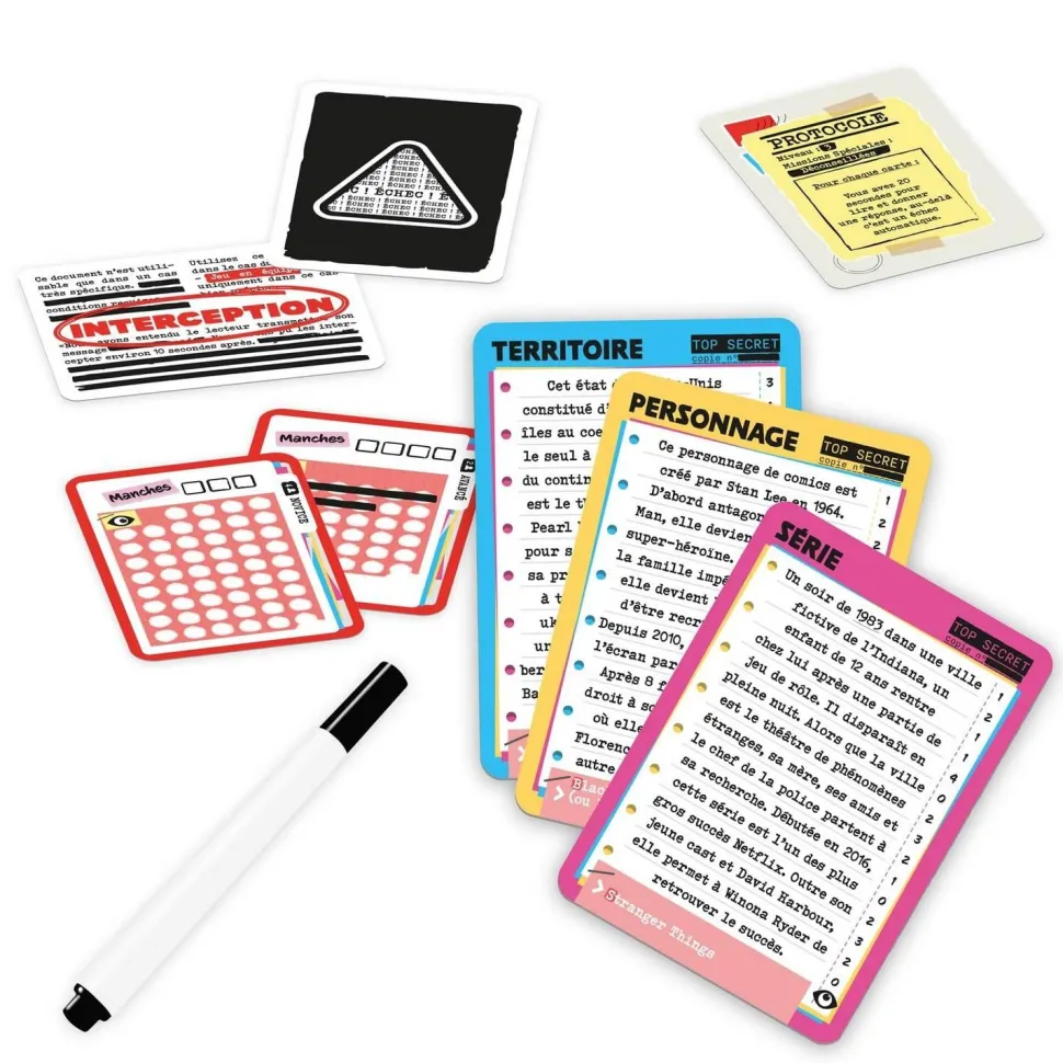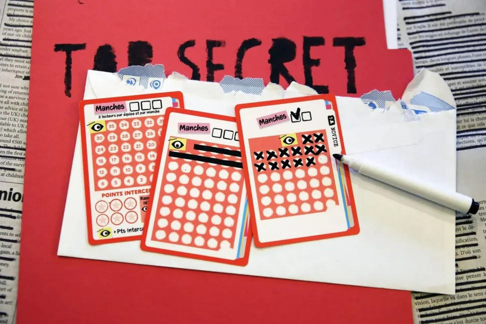Tentez de faire deviner votre document classifié en rayant les lignes superflues directement sur votre carte. Lisez ce qu’il reste à voix haute, mais attention à laisser suffisamment d’informations pour que vos coéquipiers devinent !