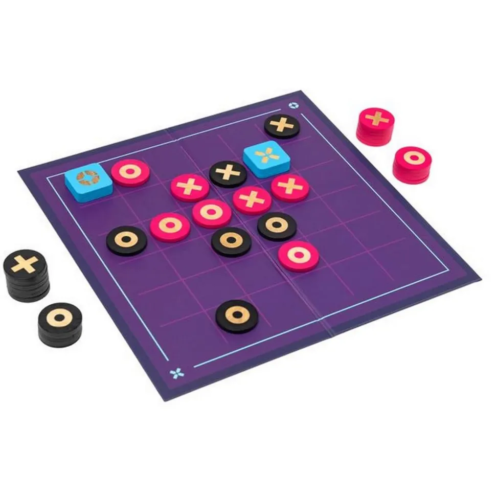 -34 pièces en bois : 16 pièces roses de symboles X et O, 16 pièces noires de symboles X et O, 2 Totems bleus (X et O)