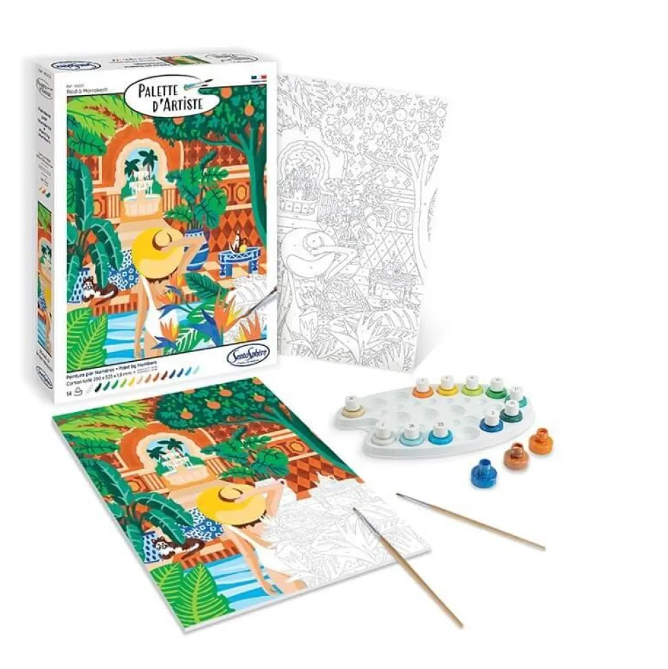 Découvrez la PALETTE D’ARTISTE – Riad à Marrakech de la marque Sentosphère. Plongez dans l’atmosphère apaisante d’un riad marocain avec la peinture par numéros Palette d’Artiste – Riad à Marrakech. Cette œuvre, inspirée de l’architecture traditionnelle marocaine avec ses arches élégantes, ses mosaïques colorées et ses cours baignées de lumière, est sublimée par des teintes chaudes qui évoquent les rayons du soleil d’été. Chaque détail de cette composition invite à l’évasion, à la contemplation et à la détente, comme si vous étiez transporté au cœur d’un riad paisible. Grâce à la peinture par numéros, vous pourrez facilement reproduire cette scène en suivant les indications, tout en laissant parler votre créativité et en apprenant à jouer avec les nuances. Profitez d’un instant de calme au cœur d’un Riad marocain ! Voyagez à travers vos coups de pinceau et laissez vous vibrer par ces couleurs chaudes vous invitant dans cet havre de paix.