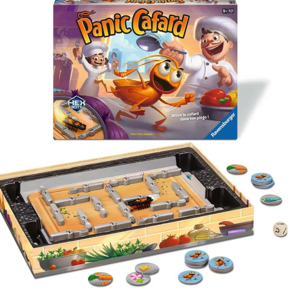 Découvrez un jeu qui vous mettra dans la peau d’un cuisinier à la recherche des cafards dans sa cuisine.Au secours, des cafards en cuisine ! Avec une étonnante agilité, l’un d’eux fonce à travers la cuisine, semant dégoût et effroi sur son passage. Plus une minute à perdre ! Guidez-le vers votre piège à l’aide des couverts. Le dé vous indique quel couvert vous pouvez faire pivoter : fourchette, couteau ou cuillère. Il s’agit alors de ne pas le perdre des yeux et d’avoir de bons réflexes. Celui qui tournera astucieusement les couverts attirera le cafard vers le piège. Chaque insecte ainsi capturé rapportera 1 jeton. Le premier joueur qui possèdera 5 jetons remportera la partie. Qui gagnera cette chasse effrénée ? Dès 5 ans. Contenu : – 1 HEXBUG® nano® (1 pile LR44 fournie)- 1 plateau de jeu en 3D muni de 18 couverts pivotants- 20 jetons Cafard- 1 dé- 2 portes- 1 règle du jeu