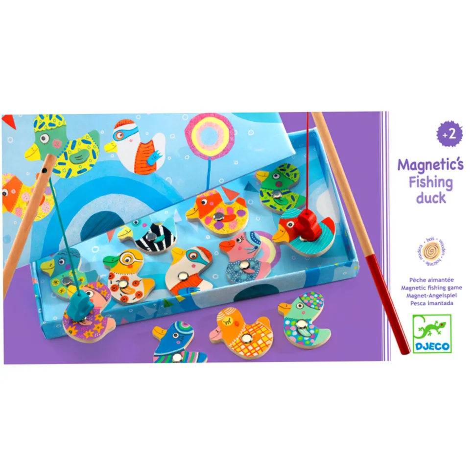 La pêche à la ligne, voilà bien un des jeux préférés des enfants, garçons et filles. Mais cette fois ce ne sont pas des poissons qu’il faut attraper, mais des canards aux looks aussi différents que rigolos ! Ce coffret contient : – 12 canards magnétiques en bois – 2 cannes à pêche Dimensions de la boîte : 28 x 15 x 2.5 cm.