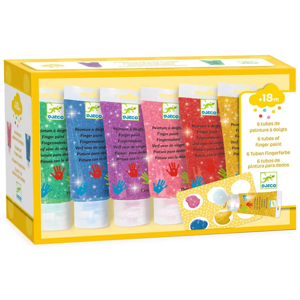 Contenu : 6 grands tubes de peinture à doigts paillettées (6 x 75ml) : Rose, doré, bleu, vert, violet, rouge. et 1 palette.