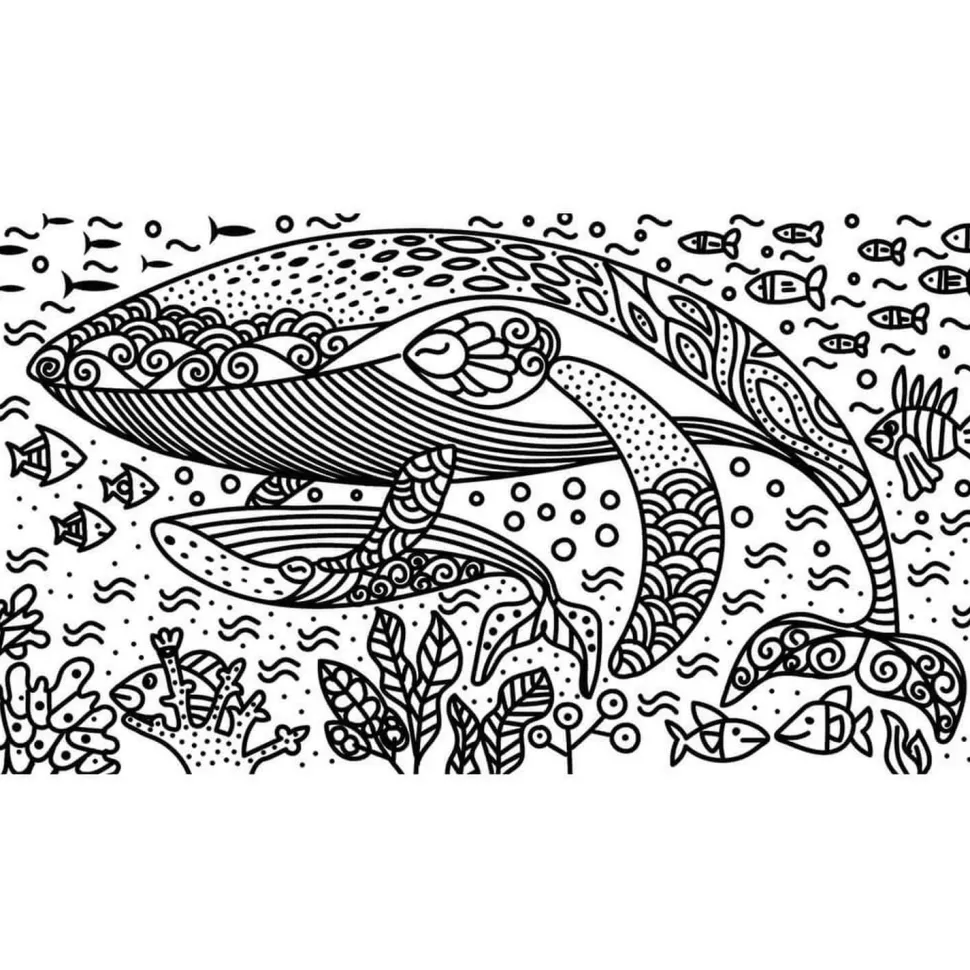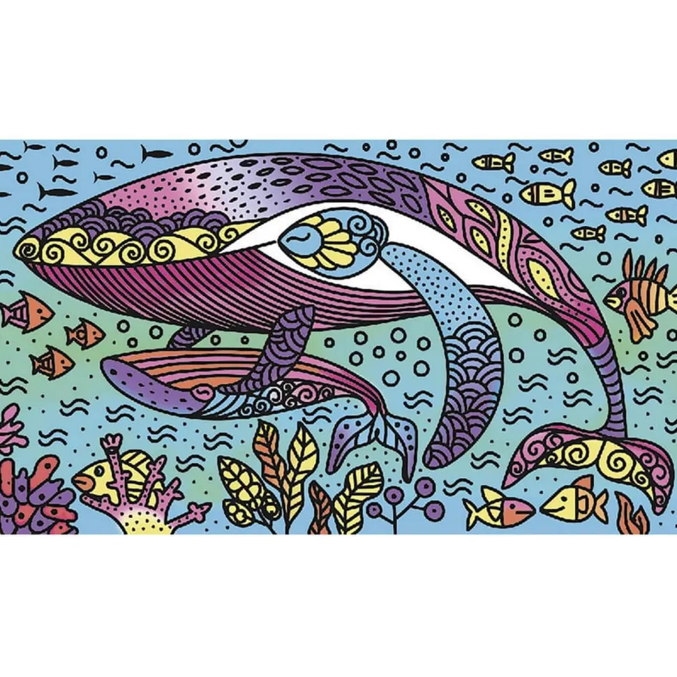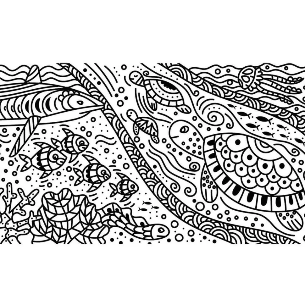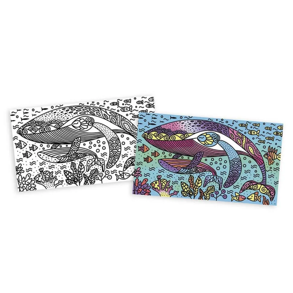 Comment ? C’est très simple, on se munit du feutre pinceau à réservoir d’eau, puis on vient délicatement remplir chaque zone de ces 6 tableaux, l’encre noire des illustrations libère de la couleur et permet de créer des tableaux somptueux, immersion totale sous les océans avec baleines, sirènes ou pieuvres majestueuses !