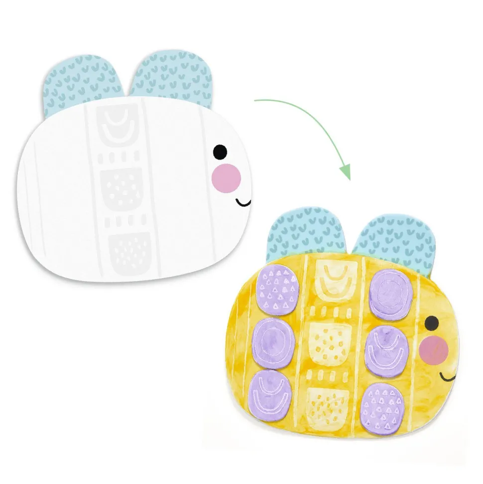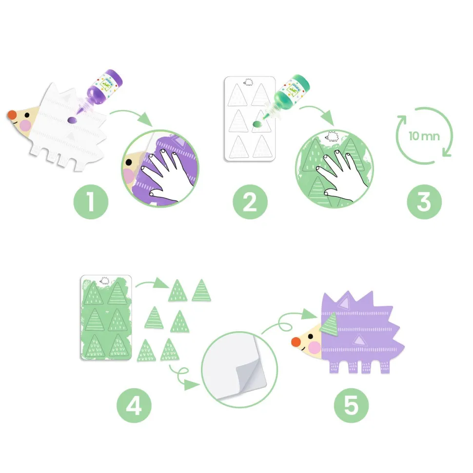 Contenu : 4 planches silhouettées à peindre, 4 planches de petites formes autocollantes à dépuncher et à peindre, 1 protection de table en papier et un livret explicatif visuel.