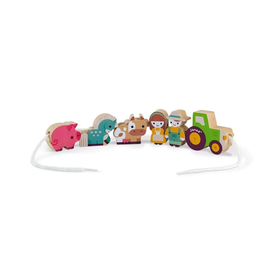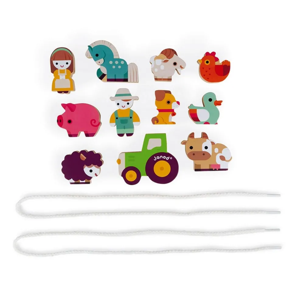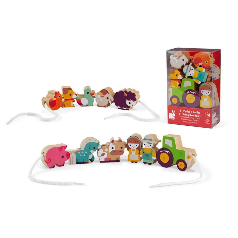 Janod présente ce nouveau jeu de perles à enfiler sur le thème de la ferme.