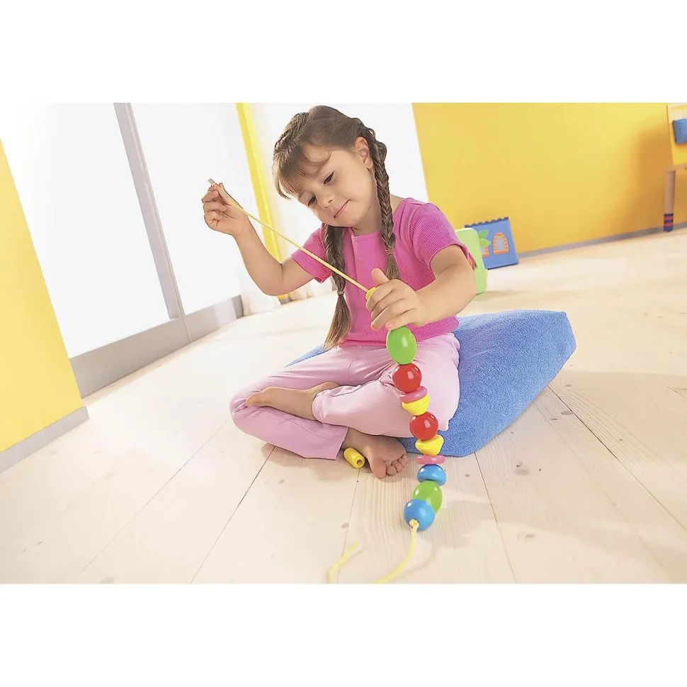 Perles BambiniDéveloppe la motricité. Contenu : – 12 pièces en bois à enfiler – 1 aiguille en bois – 1 cordelette