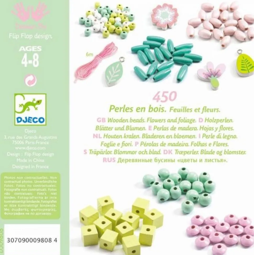Retrouvez le coffret de perles en bois édition « feuilles et fleurs » de la marque Djeco.