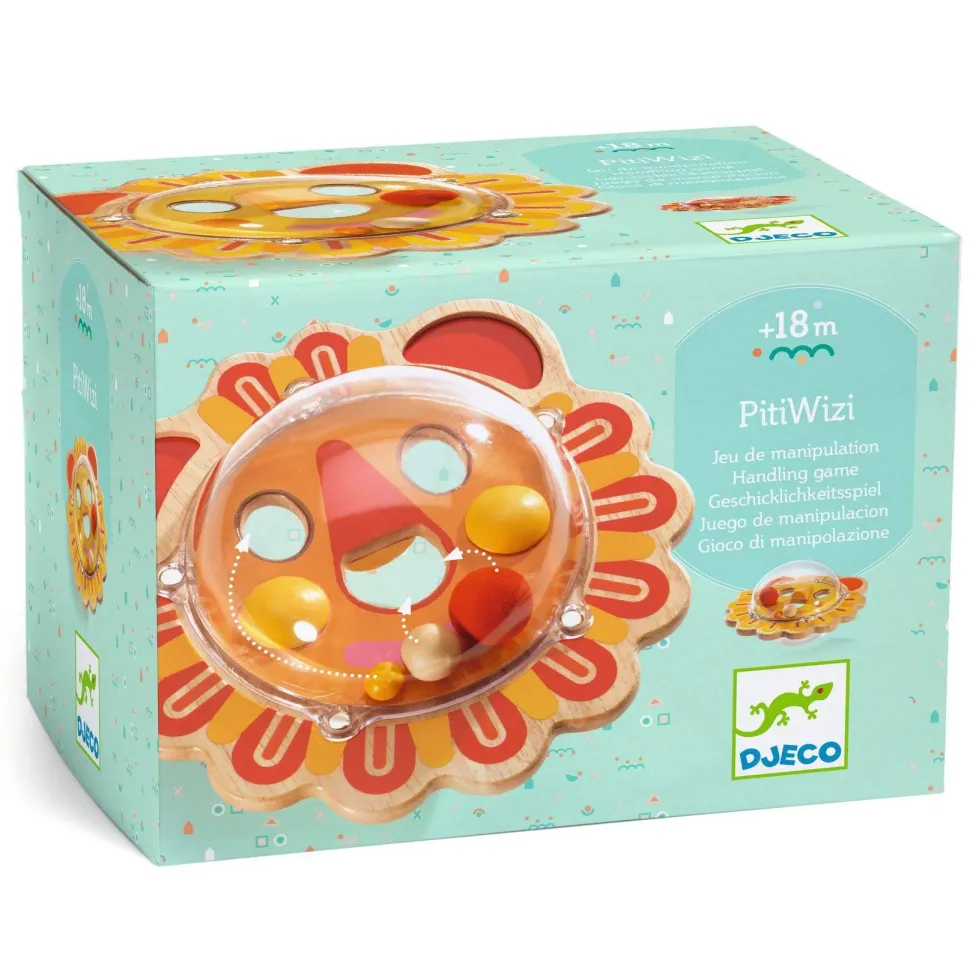 Découvrez le jeu Piti Wizi de la marque Djeco. Piti Wizi est un jeu de manipulation conçu pour les tout-petits. En appuyant sur la table, l’enfant fait basculer la balle afin de diriger facilement les billes autour des murets et vers le trou pour les faire disparaître. Une fois cette mission accomplie, il suffit de retourner la balle pour découvrir une nouvelle image et recommencer l’exercice avec un autre défi. Ce jeu stimule la coordination œil-main et l’habileté tout en offrant des sons différents grâce aux trois billes de tailles et de matériaux variés. Chaque bille génère un bruit distinct et présente une difficulté différente, offrant ainsi une expérience de jeu enrichissante et amusante. L’enfant apprend à éviter les murets tout en dirigeant les billes vers le trou.