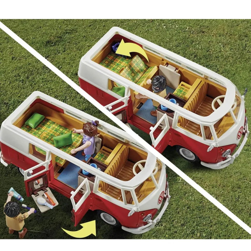 Le Volkswagen T1 est une icône de la route. Adoré par des générations, d’innombrables aventuriers ont parcouru le monde dans ce camping-car. Bien sûr, la version PLAYMOBIL possède tous les détails qui en ont fait la légende qu’elle est aujourd’hui comme la séparation des couleurs en forme de V et logo VW rouge à l’avant, le toit arrondi, le pare-brise scindé et galerie de toit amovible. Les banquettes avec le motif à carreaux typique des années 60 peuvent être converties en un espace de couchage pour deux personnes. Les portes latérales peuvent être ouvertes.