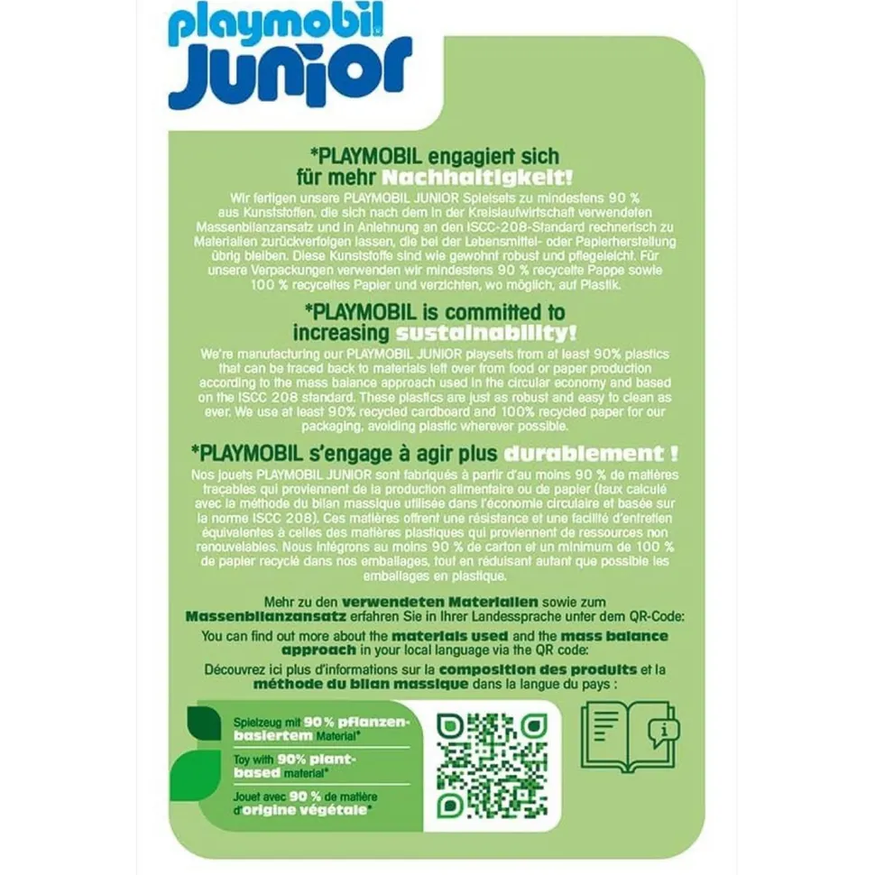 Tous les jouets PLAYMOBIL JUNIOR sont fabriqués avec plus de 90 % de plastique biosourcé (certifié ISCC PLUS). L’origine du plastique peut être retracée jusqu’à des matières premières biosourcées grâce à l’approche du bilan massique.
