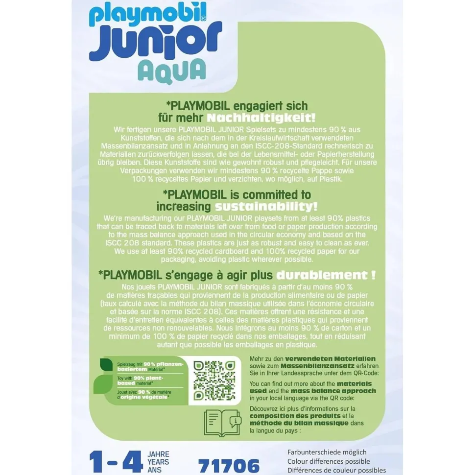 Tous les jouets PLAYMOBIL JUNIOR sont fabriqués avec plus de 90 % de plastique biosourcé (certifié ISCC PLUS). L’origine du plastique peut être retracée jusqu’à des matières premières biosourcées grâce à l’approche du bilan massique.