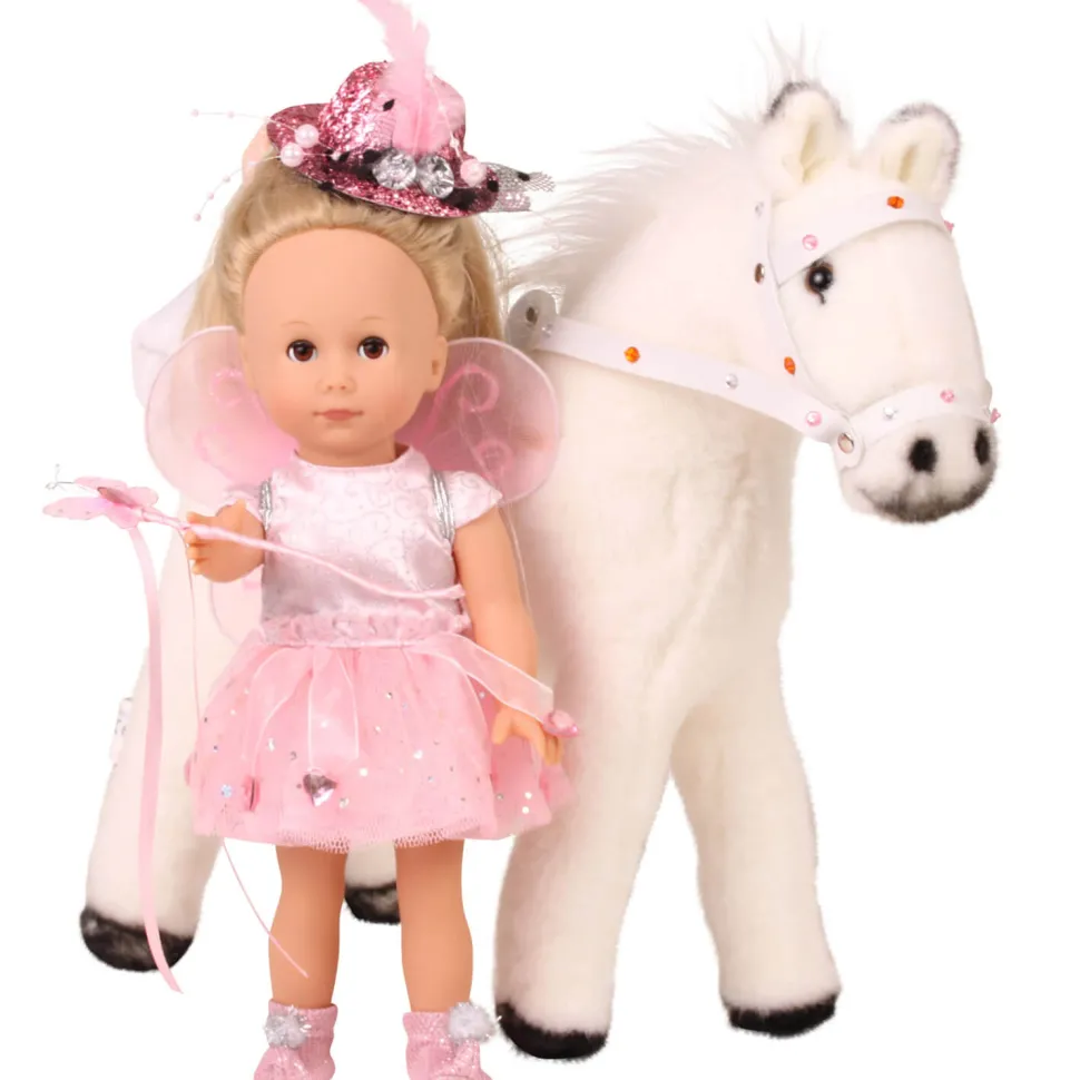 Vous rêviez d’avoir une fée comme amie, Paula sera justement une amie très spéciale qui vous enchantera !Paula, votre poupée aux cheveux longs blonds et aux yeux bleus, est vêtue d’une jolie robe rose digne d’une fée. Le haut de la robe à l’effet satiné rose avec des arabesques argentées qui scintillent est cousue à une jupe en tulle rose agrémentée de coeurs. Elle porte en plus des chaussons roses scintillants et un chapeau serre-tête à paillettes rose orné d’une plume. Un look chic et scintillant qui est complété d’une baguette magique et d’une paire d’ailes !Dimensions de la poupée : 27 cm.Cette poupée aux yeux dormeurs quand on l’allonge fait partie de la collection Just like me de la célèbre marque allemande Götz. Les petites mamans de 3 ans et plus y retrouveront des poupées qui leur ressemblent beaucoup !Note : la licorne n’est pas fournie.