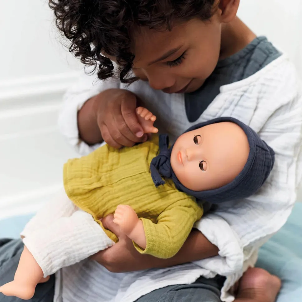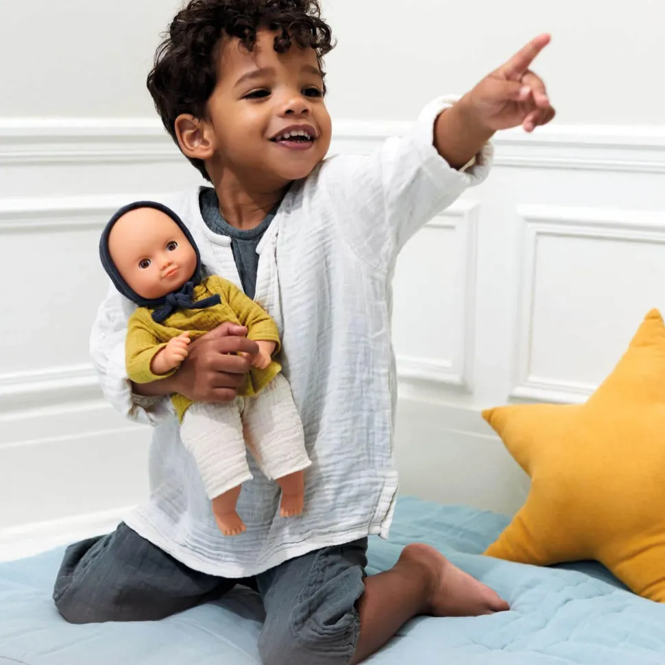 Avec ses beaux yeux marrons et sa tenue tendance, Baby Camomille est une poupée pour les enfants dès 18 mois. Elle est légère et sa taille (32 cm) est parfaitement adaptée aux petits bras. Son corps souple est imprimé d’un joli « body » et permet de la positionner comme un vrai bébé. Son visage, ses bras et ses jambes sont en vinyle très doux, agréable au toucher. Avec ses yeux dormeurs, elle s’endort quand on la couche sur le dos. Ce poupon est habillé d’un bloomer, d’une chemise et d’un béguin en double Gaze 100 % coton. Contenu : 1 poupée de 32 cm (corps en tissu et tête, bras et jambes en vinyle), 1 bloomer, 1 chemise manches longues et 1 béguin.